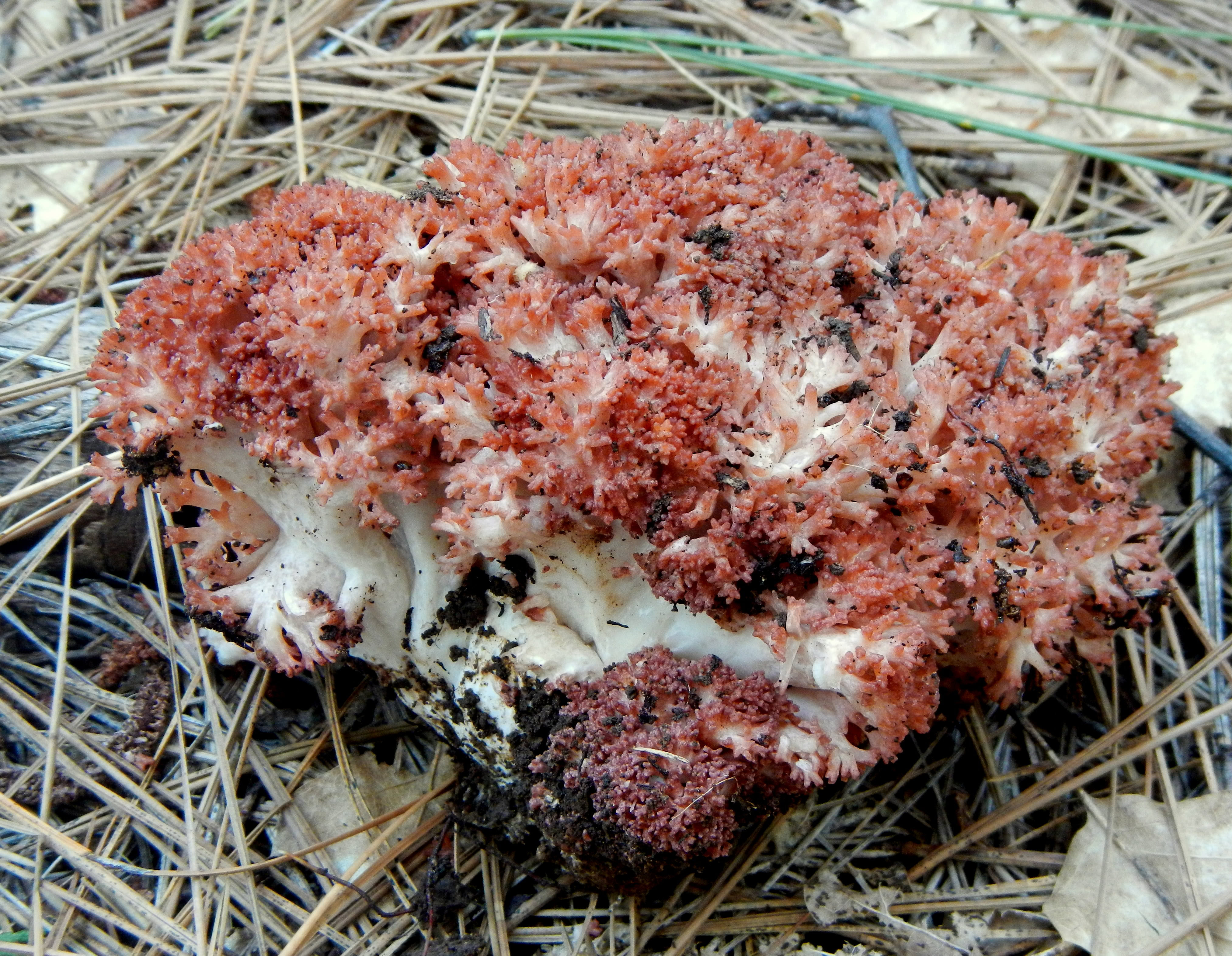Elle pousse sur le sol et mesure de 9 à 13 cm (3 à 10 cm).5-5.1 in) de large sur 9-16 cm (3.5-6.3 in) de hauteur. Les jeunes corps fructifères ont des branches blanchâtres à jaune clair (qui en séchant deviennent brun fauve avec une teinte rougeâtre) avec des extrémités rosâtres à rougeâtres.