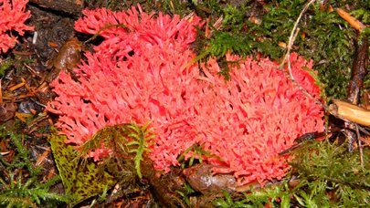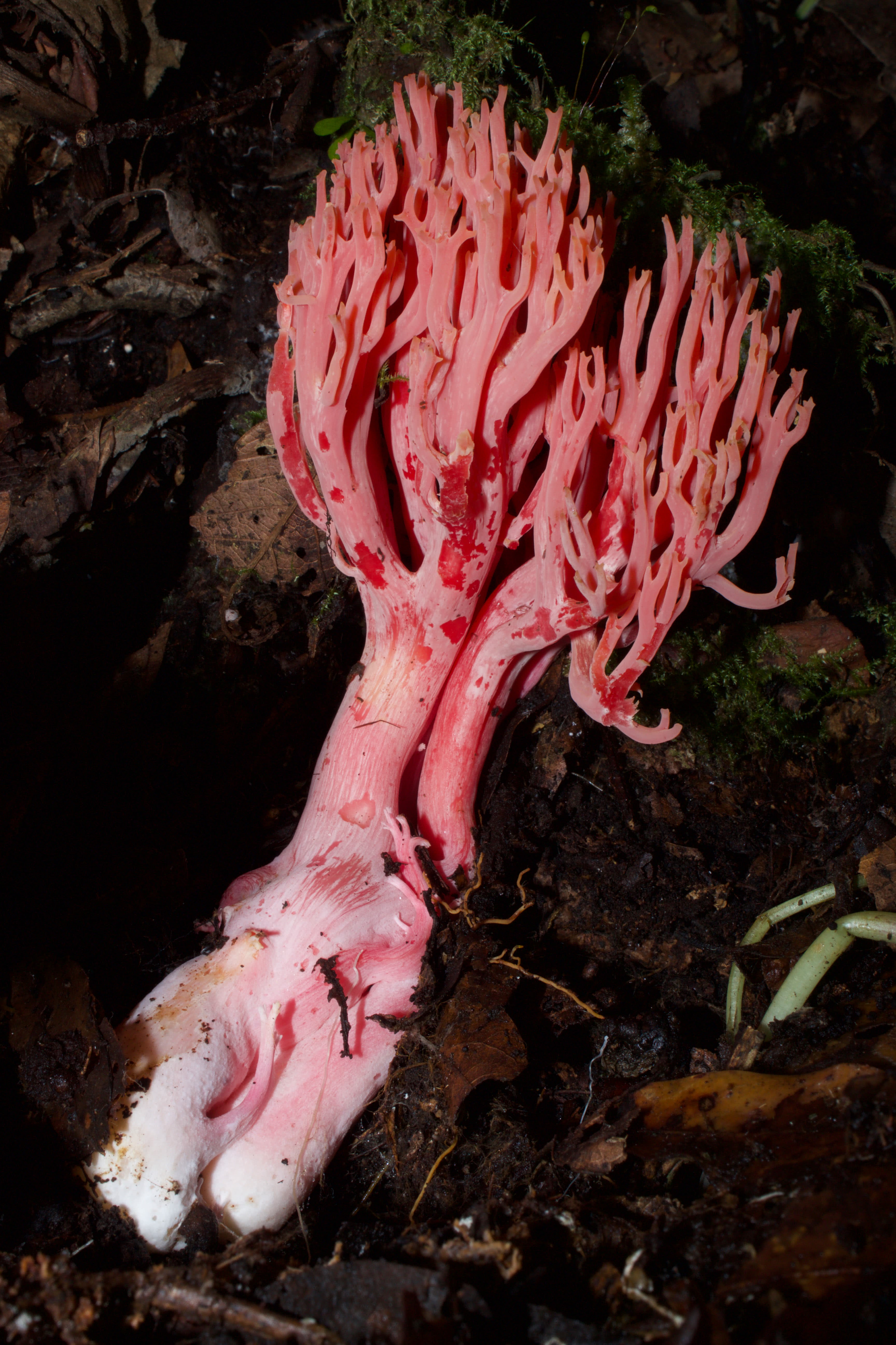 Ramaria araiospora est l'un des plus beaux champignons du monde. Il se distingue par ses branches d'un rouge rosé profond à rouge écarlate, ce qui en fait un champignon corallien d'une beauté saisissante et presque impossible à confondre. Il existe deux variétés : le var. araiospora, dont l'extrémité des branches est jaune/orange, et var. rubella, dont les extrémités des branches sont rouges.