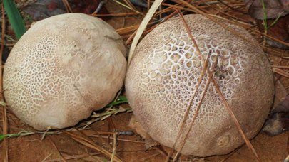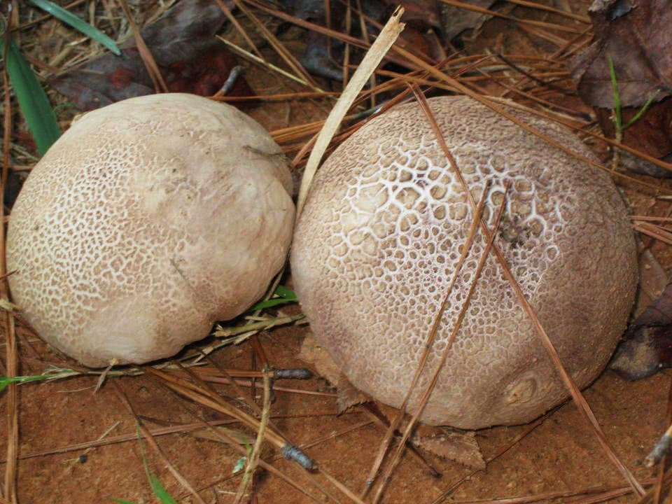 Un autre champignon comestible avec des chapeaux ronds et blancs est similaire aux champignons à boules et provient de la même famille de champignons. La principale différence est un corps de fruit en forme de poire et une poussière de spores brune.