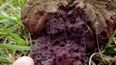 Blanc et ferme lorsqu'il est jeune ; il devient rapidement bicaméral, la partie basale étant distincte de la partie supérieure ; la partie supérieure devient jaunâtre et enfin violet brunâtre foncé à mesure qu'elle mûrit et se transforme en poussière de spores ; la partie basale devient jaunâtre, puis olive avec l'âge.