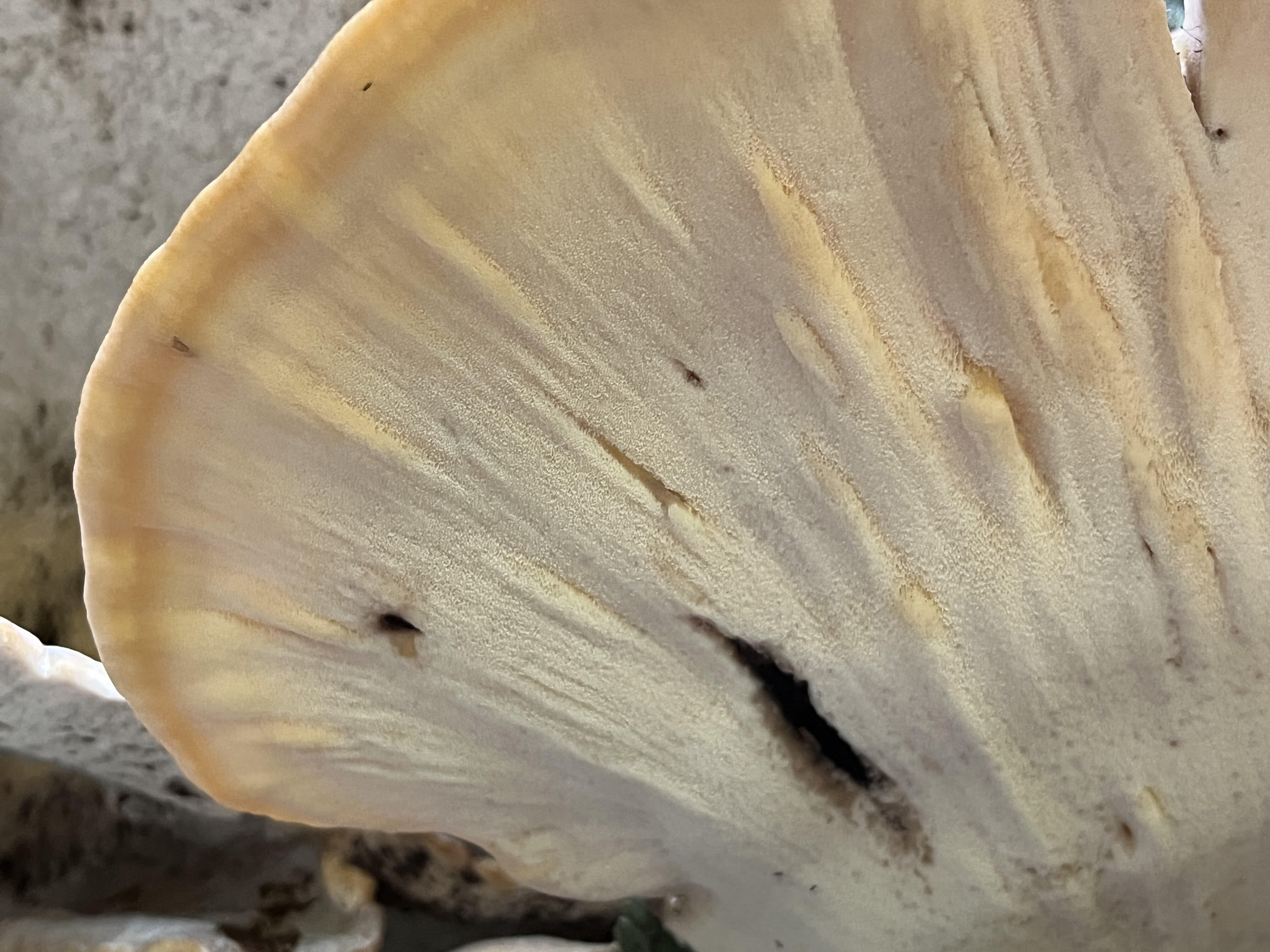 L'hyménophore, ou la surface inférieure, est tubulaire. D'abord blanche, elle devient ensuite gris sale et peut devenir grise ou noire en cas de contact. Les tubes, d'une longueur de 4 à 6 mm, descendent le long de la tige. Les pores sont petits, avec un diamètre de 0.25-0.5 mm. Ils sont arrondis et commencent par être d'un blanc uni, puis développent un bord incisé, gris sale. La densité est de 3-4 pores par 1 mm.