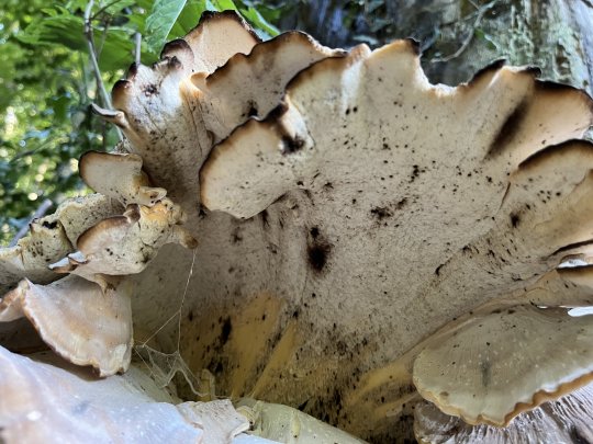 L'identification de cette espèce peut être délicate car sa couleur et l'épaisseur de ses bords varient au fur et à mesure de sa croissance. Lorsque le champignon est jeune, les bords sont émoussés et arrondis, mais ils deviennent plus fins et plus aigus à mesure que le champignon mûrit. Lorsqu'elle pousse sur des racines d'arbres enfouies, elle peut prendre une belle forme de rosette symétrique. Si vous touchez le dessous de ce champignon, il devient rapidement brun foncé ou noir. En raison de cette réaction de coloration, certains l'appellent le polypore noir.