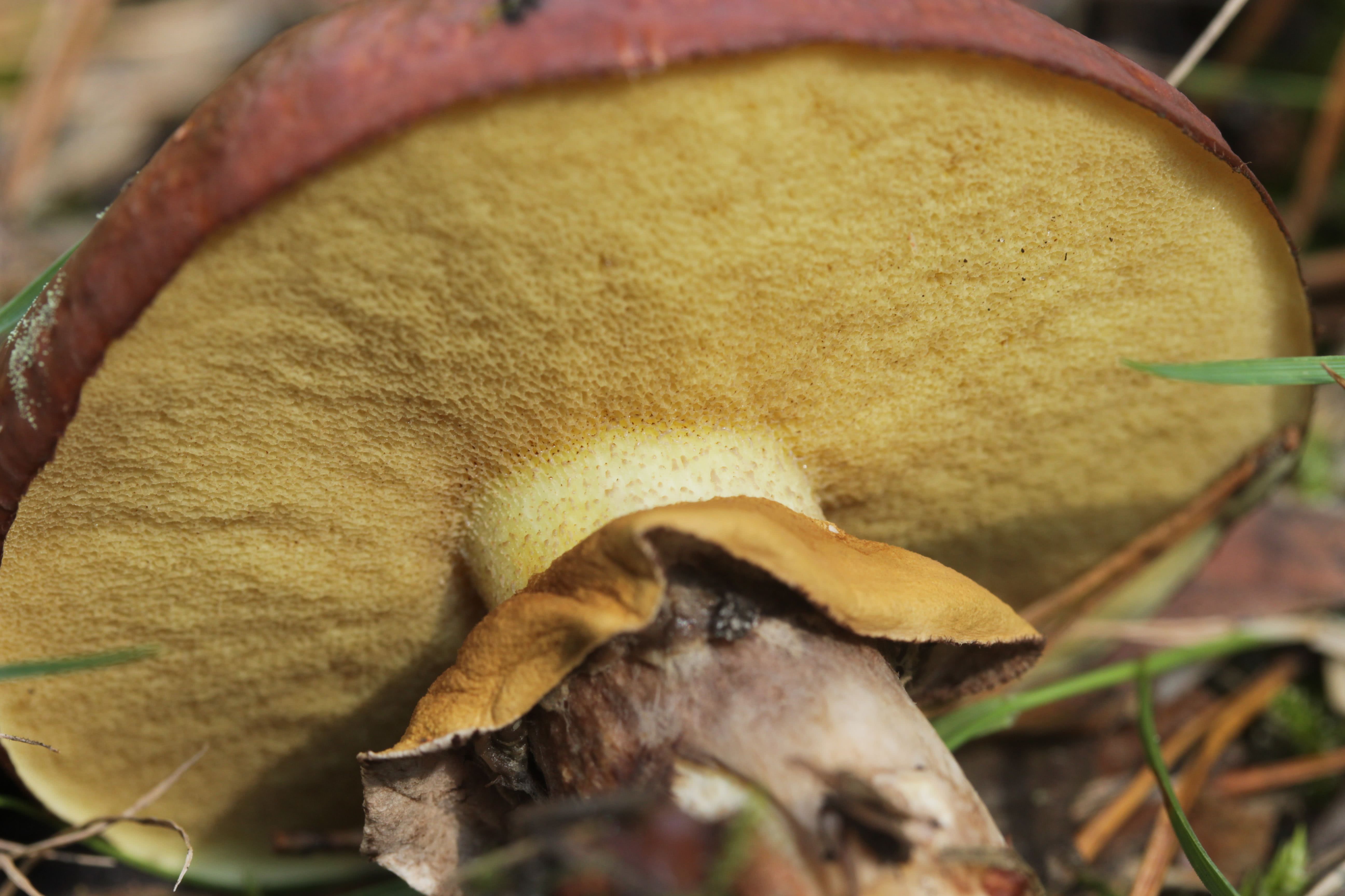 Recouvert d'un voile partiel blanchâtre lorsqu'il est jeune ; blanchâtre à jaune pâle, devenant jaune à jaune olive avec l'âge ; pas de meurtrissures ; pores de moins de 1 mm de diamètre ; tubes de 4 à 15 mm de profondeur.