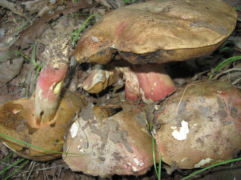 Le chapeau est blanc crayeux avec des pores rouges et une tige bulbeuse rouge.