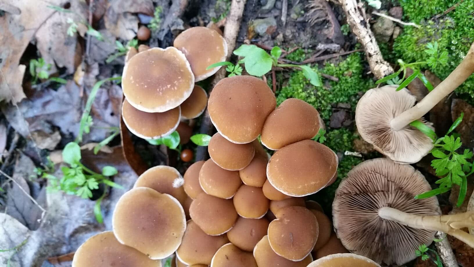 Kuehneromyces mutabilis, Le champignon de la tige brune pousse également en touffes sur les souches ; il a un anneau sur la tige, et la tige est brune et, au lieu d'être lisse, elle est couverte d'écailles à la base.