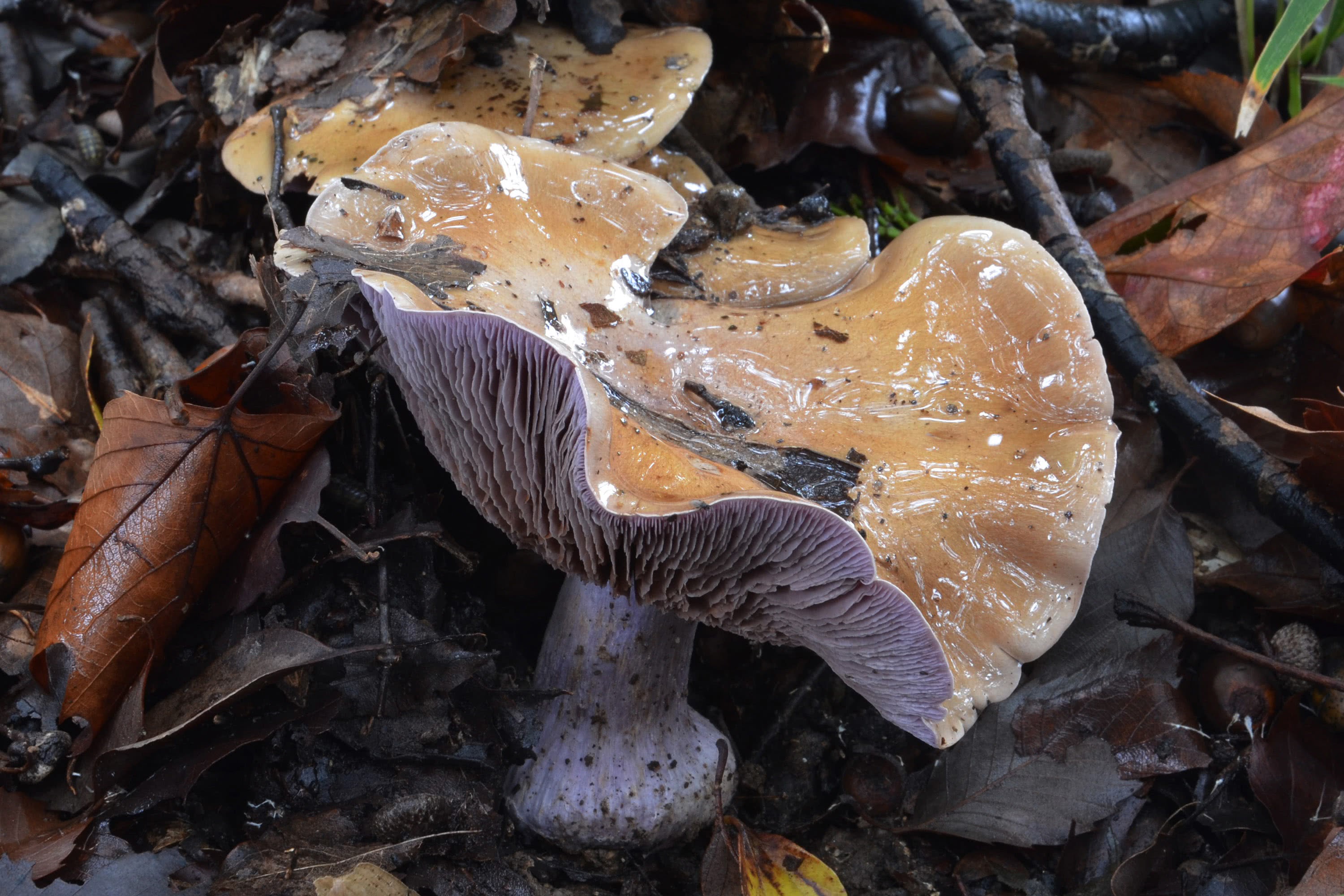 Autres Cortinarius spp pourpres, en particulier C. violaceus, qui est d'un violet profond. Bléine des bois Clitocybe nuda, Le bord du chapeau s'enroule sous la tige et est commun.