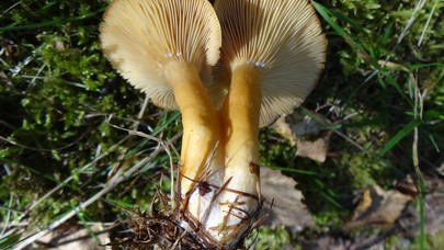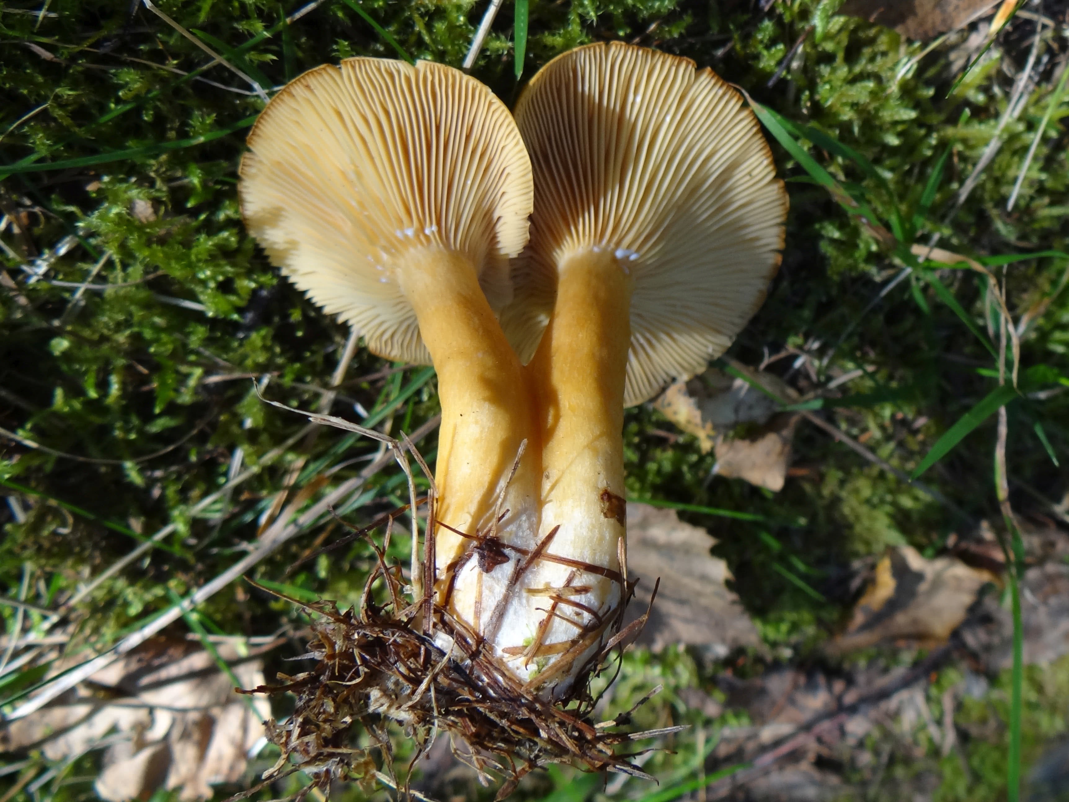 2-4 cm de long ; 1-1.5 cm d'épaisseur ; légèrement effilé à la base ; sans nids de poule ; chauve ; orange pâle ; mycélium basal blanc.