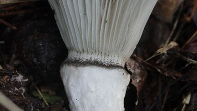Bien qu'il s'agisse d'une espèce boletale, Gomphidius roseus a des branchies épaisses plutôt que des pores. Profondément décurrentes, les branchies sont gris pâle et finissent par devenir gris souris (comme sur l'image de gauche) au fur et à mesure que le corps du fruit vieillit.