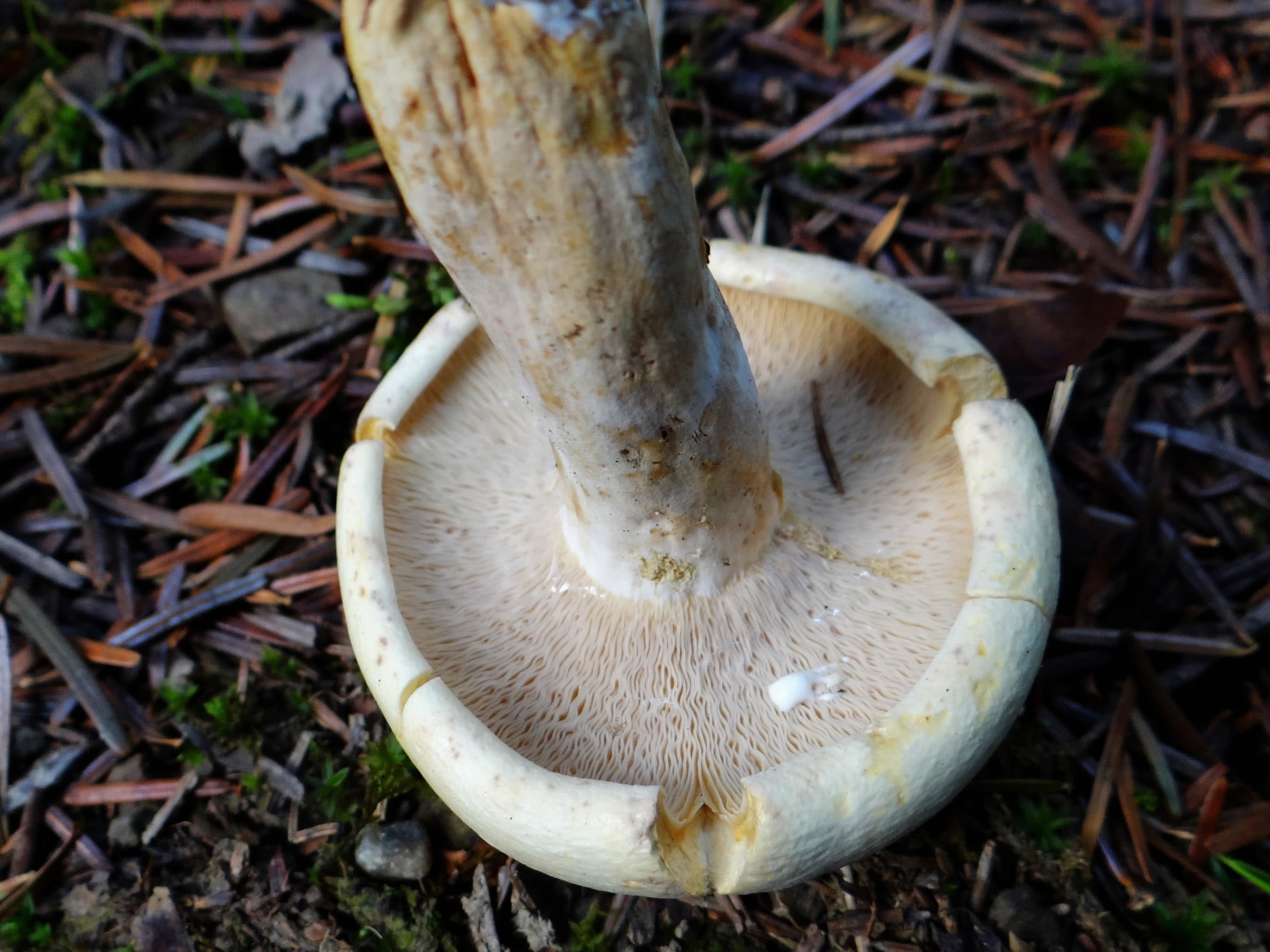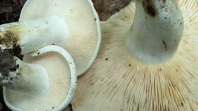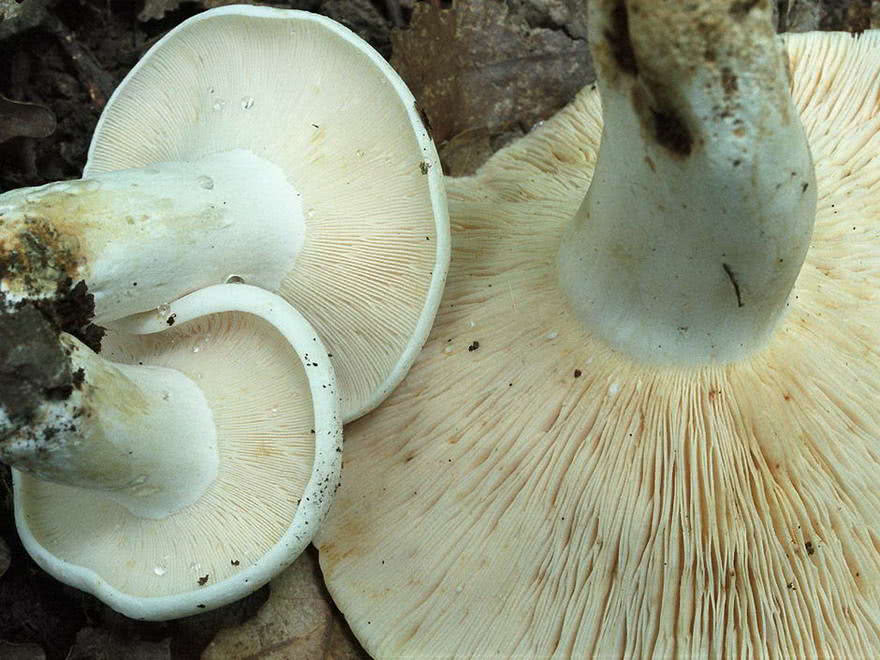 Les branchies de ce champignon sont attachées au pied ou descendent légèrement le long de celui-ci, sont très serrées et bifurquent fréquemment. Elles sont d'abord blanches, puis deviennent crème pâle au fur et à mesure que le champignon vieillit.