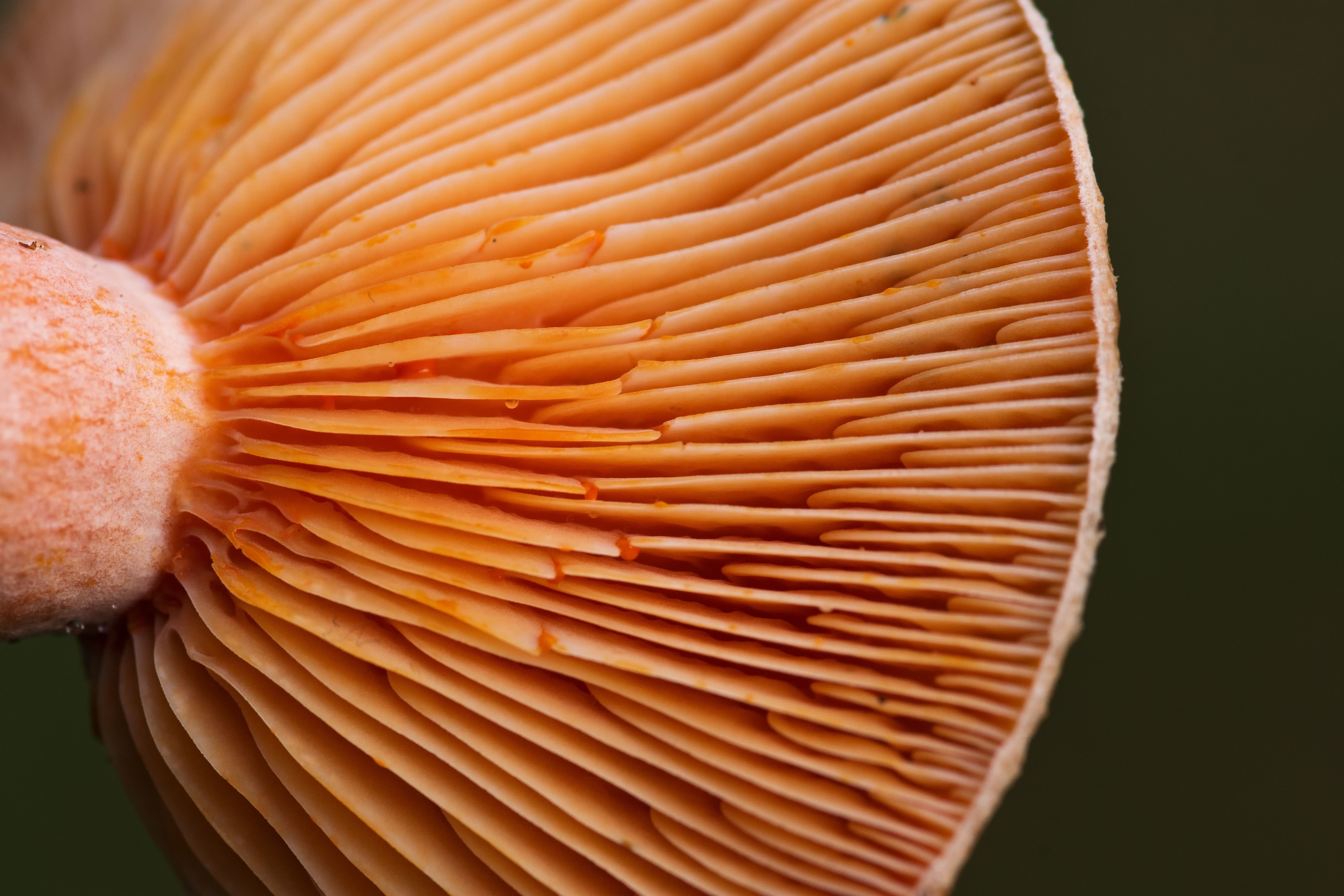 Les branchies du champignon sont largement attachées au pied ou commencent à couler le long de celui-ci. Elles sont proches, avec de fréquentes branchies courtes, et sont orange avec des taches vertes qui se développent.