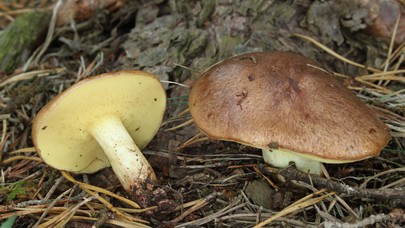 Une autre espèce commune et largement répandue, présente dans le même habitat. S. luteus présente un voile et un anneau partiels bien visibles et ne présente pas de gouttelettes laiteuses sur les pores.