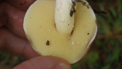 a un stipe court sur le chapeau et ne suinte pas de gouttelettes de la surface des pores.