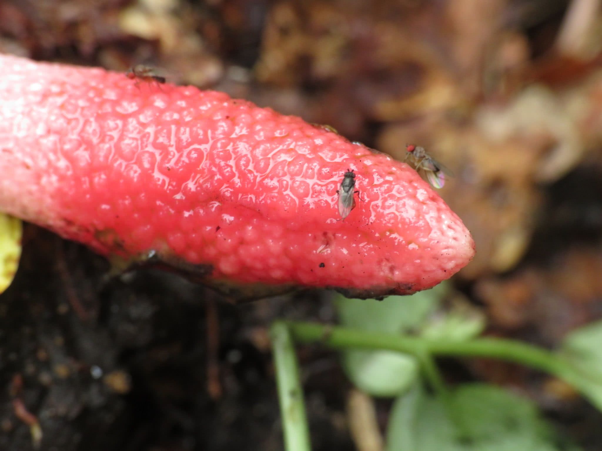 Mutinus ravenelii est un champignon qui pousse sur des sols transformés ou perturbés, généralement comme saprophyte sur des copeaux de bois, de la paille, de la sciure ou du compost dans les parcs et les jardins, mais parfois aussi sur du bois en décomposition dans les forêts de feuillus et de conifères. Lorsqu'il est jeune, le champignon ressemble à un "œuf du diable" allongé et blanc." L'apex du corps fructifère est initialement de couleur foncée. Il est recouvert d'une masse visqueuse gris foncé qui sent la charogne ou les excréments de chat et qui contient les spores. Les mouches sont attirées par cette odeur ; elles lèchent les spores et contribuent ainsi à la propagation du champignon. Les spores qui ont traversé le tractus intestinal d'une mouche peuvent encore germer. Lorsque les mouches ont terminé leur travail, il reste une pointe rouge vif, ressemblant à une framboise, sur une tige rose. La tige est creuse et spongieuse, ce qui fait que le champignon tombe rapidement.