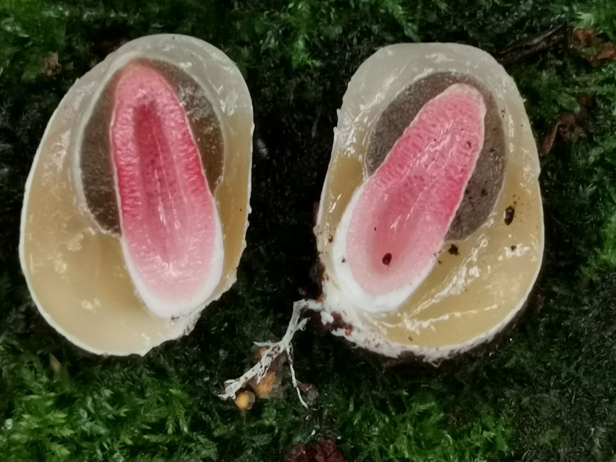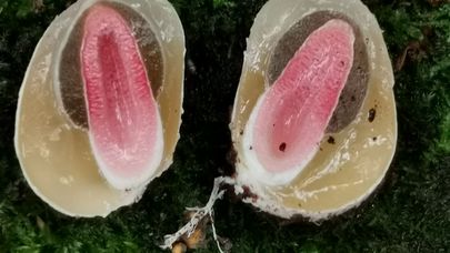 Le corps fructifère immature est un "œuf" blanchâtre à légèrement jaunâtre de 0,5 cm de large.59 à 0.79 pouces (1.Le corps fructifère a une hauteur de 5 à 2 cm et un diamètre de 0,5 cm.39 à 0.59 pouces (1 à 1.5 cm de large. La surface est lisse, et lorsqu'on la coupe, on découvre le stinkhorn en devenir enveloppé d'une substance gélatineuse.