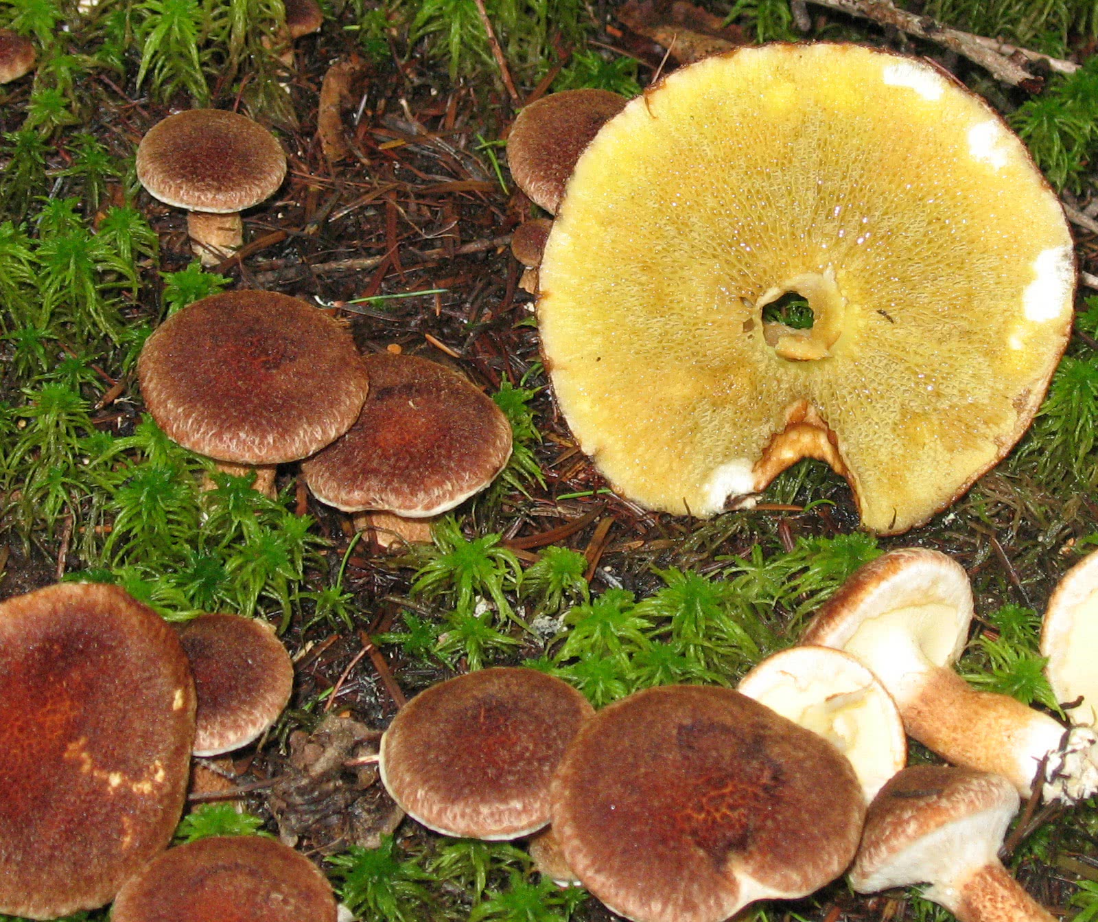 Jaune ou jaune verdâtre ; pas de meurtrissures ; pores anguleux et disposés radialement (mais pas boletinoïdes), d'environ 1 mm de diamètre ; tubes jusqu'à 5 mm de profondeur.