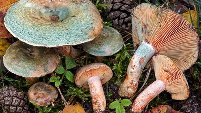 Lactarius semisanguifluus est une espèce de champignon de la famille des Russulaceae. Le chapeau est de taille variable et ne dépasse pas 3 ou 4 cm, bien qu'il soit plus courant de le trouver avec un diamètre compris entre 5 et 10 cm. Cette mesure dépend des précipitations survenues au cours de la saison de croissance et de sa zone de distribution. Lorsqu'ils sont jeunes, ce chapeau a une forme convexe. Lorsqu'il atteint l'âge adulte, il devient en forme d'entonnoir. Sa couleur est orange pâle et présente des zones concentriques peu marquées. Au fur et à mesure qu'il se développe, il devient rapidement verdâtre avec des teintes grisâtres et des zones vertes plus foncées.