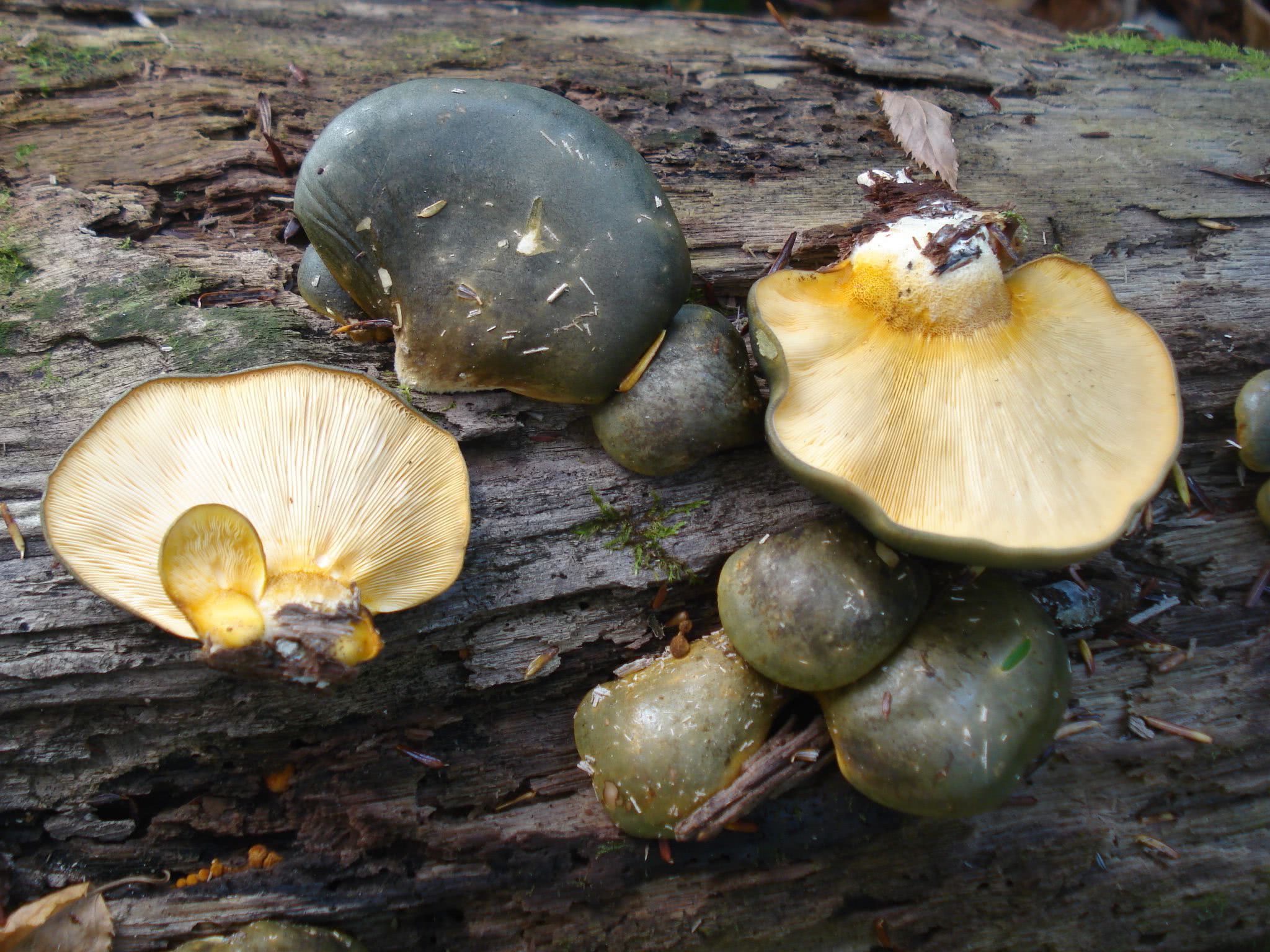 3-11 cm de large ; semi-circulaire ou en forme de coquille ; plan-convexe à plat ou légèrement déprimé ; collant à l'état frais ; chauve ; terne, vert foncé à olive à l'état frais, devenant jaunâtre ou verdâtre, ou parfois s'assombrissant jusqu'à un brun moyen.