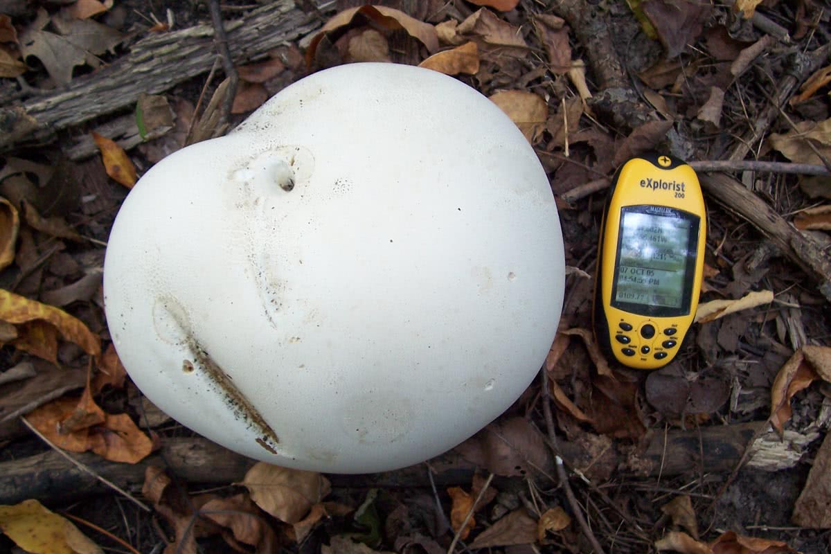 Le Calvatia gigantea, également connu sous le nom de "bouffi géant", est un champignon de grande taille qui peut atteindre 23 cm de diamètre.62 pouces (60 cm) de diamètre. Il est rond et blanc, avec une peau épaisse et pelée, et possède un cordon en forme de racine qui le relie au sol.