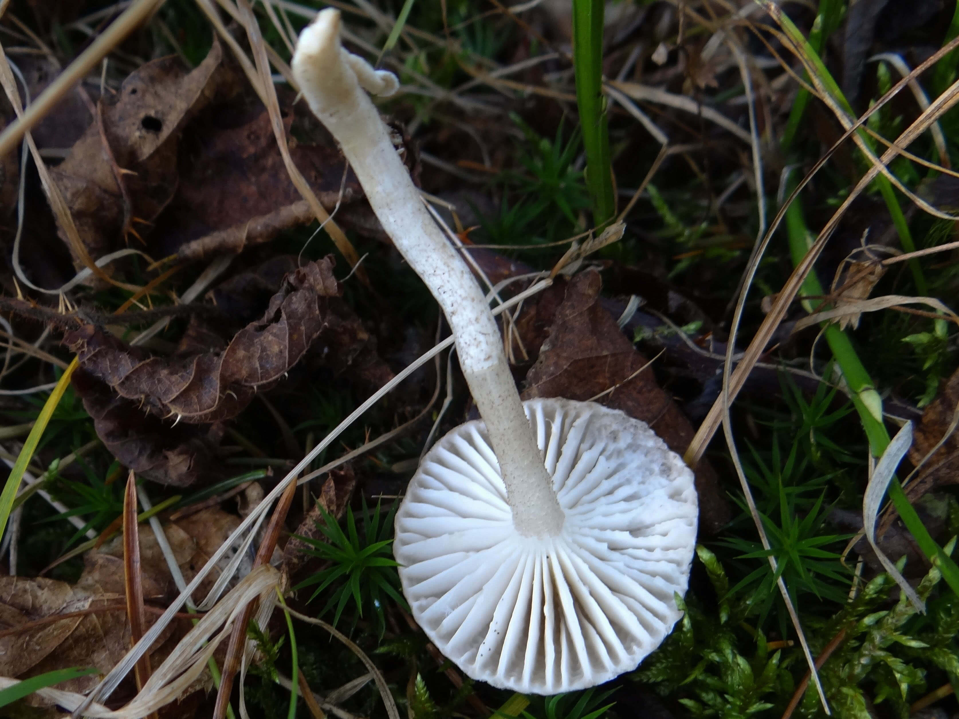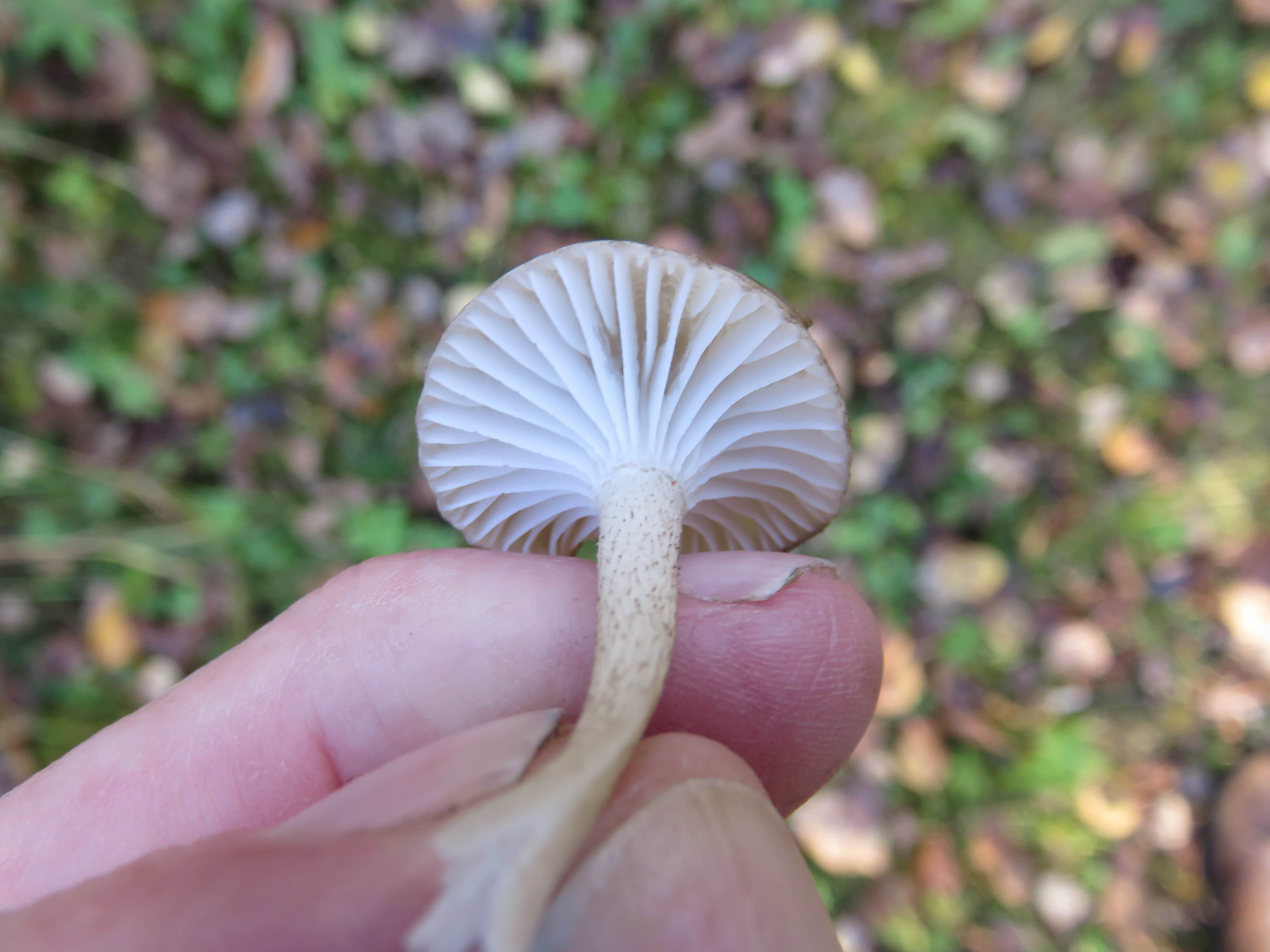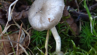 3-7 cm de long ; jusqu'à 1.5 cm d'épaisseur ; plus ou moins égaux ; très frais et jeunes, recouverts de bave sur la partie inférieure, mais rapidement secs ; blanchâtres ; couverts de minuscules points fibreux (surtout sur la moitié supérieure) qui deviennent brun grisâtre avec la maturité ou lorsque le champignon est séché.