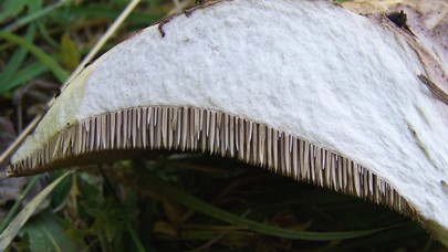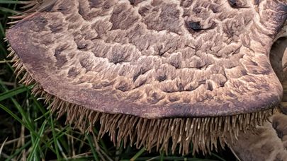 Se distingue par un chapeau grossier à écailles foncées et une surface fertile à dents brunes.