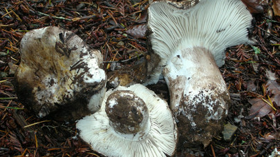 Russula albonigra est une espèce de champignon de la famille des Russulaceae. Le chapeau est convexe à infundibuliforme, blanchâtre, collant. Le stipe est sombre ou blanc sur le dessus, gris-ocre pâle vers la base. Les branchies sont décurrentes, entassées, épaisses, inégales, reliées par des veines, blanchâtres ou jaunâtres. La chair est blanche, devient noire ou fuligineuse. Le goût est quelque peu amer et désagréable pour les personnes douces. Habitat solitaire à grégaire dans la tourbe sous les conifères ; fructification de l'automne à l'hiver dans les forêts mixtes de conifères ou de feuillus-conifères le long de la côte nord et des contreforts de la Sierra.