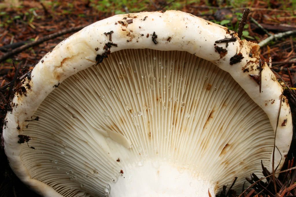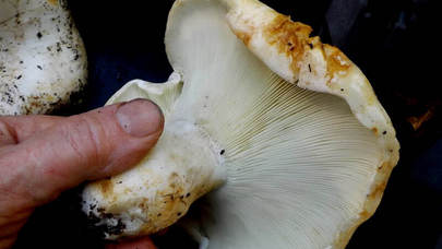 Attachée à la tige ou descendant légèrement le long de celle-ci ; entassée ou serrée ; branchies courtes fréquentes ; blanche au début, devenant crémeuse ; parfois tachetée et décolorée de brunâtre ; parfois bleuâtre à bleue, surtout près de la jonction avec la tige.