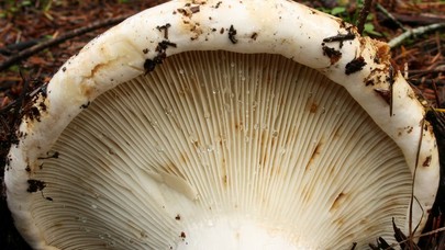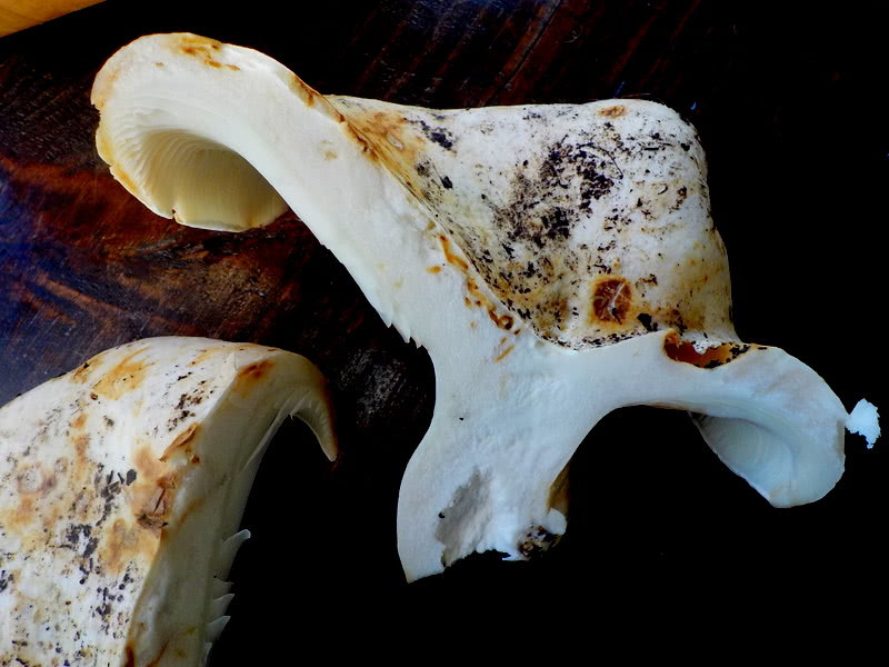 Le champignon à chapeau de lait peut être distingué de l'espèce R. brevipes par la production de latex lorsque le tissu du champignon est coupé ou blessé.