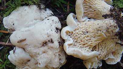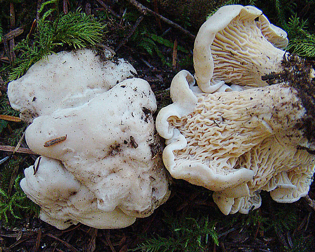 Avec de fausses branchies qui descendent le long de la tige ; souvent avec des veines fourchues ou croisées ou, dans certains spécimens, ondulées de manière élaborée et irrégulière ; blanc, meurtrissures et décoloration jaunâtre à orangée.