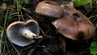 3-5 cm de large ; convexe, devenant largement convexe ; chauve ; visqueuse ; lilas brunâtre terne ; la marge est parfois bordée d'une ligne noirâtre.