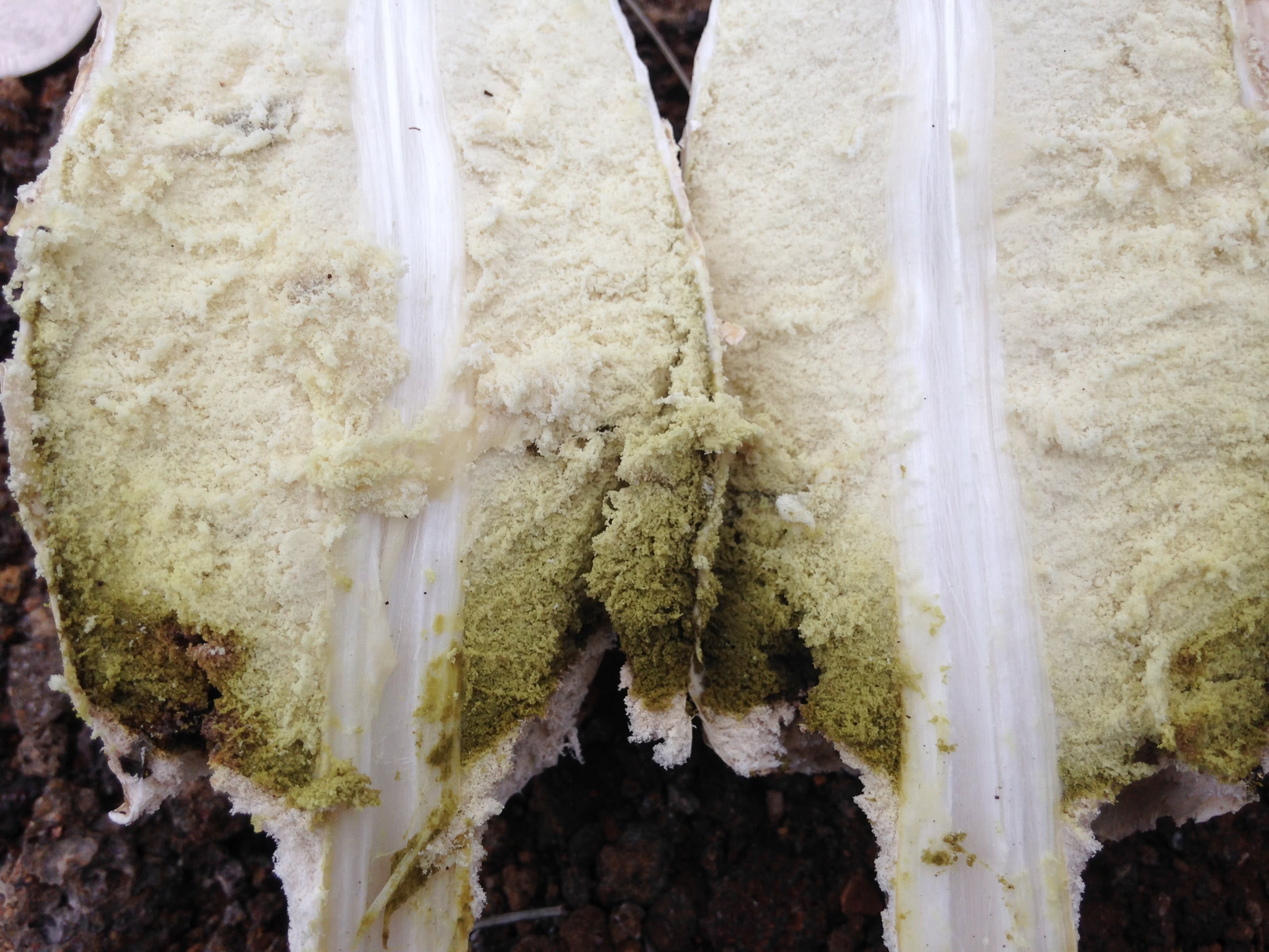 Composé de plaques contorsionnées ressemblant vaguement à des branchies ; d'abord blanchâtre, il devient rapidement brunâtre et finit par se transformer en une poudre brun foncé à presque noire.