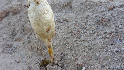 S'étendant dans le chapeau ; 4-10 cm de long sous le chapeau ; jusqu'à 1 cm d'épaisseur ; plus ou moins égale au-dessus d'une base qui est généralement enterrée et enracinée dans le sable ; extrêmement coriace et ligneuse ; grossièrement fibrillaire à écailleuse ; blanchâtre à brunâtre ; sans anneau.