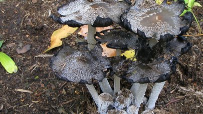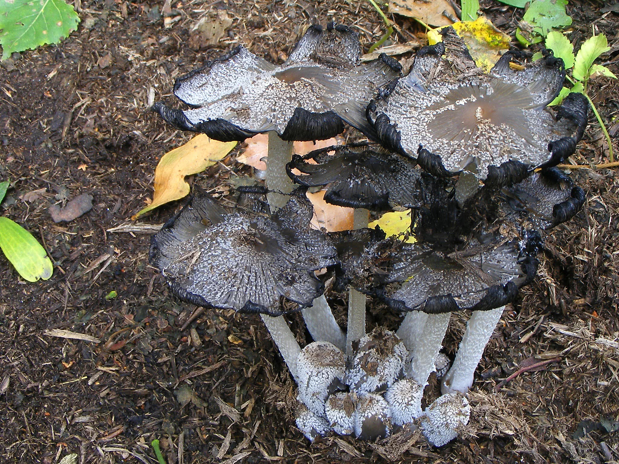Attachée à la tige ; entassée ; pâle au début, mais bientôt grise, puis noirâtre ; déliquescente (se transformant en "encre" noire) ou simplement en train de se détériorer et de s'effondrer par temps sec.