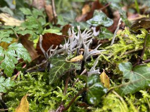 2-10 cm de long ; 2-15 mm d'épaisseur ; soit étroitement cylindrique, avec un apex pointu - soit cylindrique en dessous mais ramifié et aplati au-dessus, ressemblant quelque peu à des bois d'élan, avec des pointes effilées sur la plupart des branches ; surface noire et légèrement floue en dessous, mais poudreuse et grise à presque blanche au-dessus ; apex extrême atténué, blanchâtre à jaunâtre, et chauve ; parfois avec une structure enracinée, noire, ressemblant à une tige ; chair intérieure blanche et coriace.
