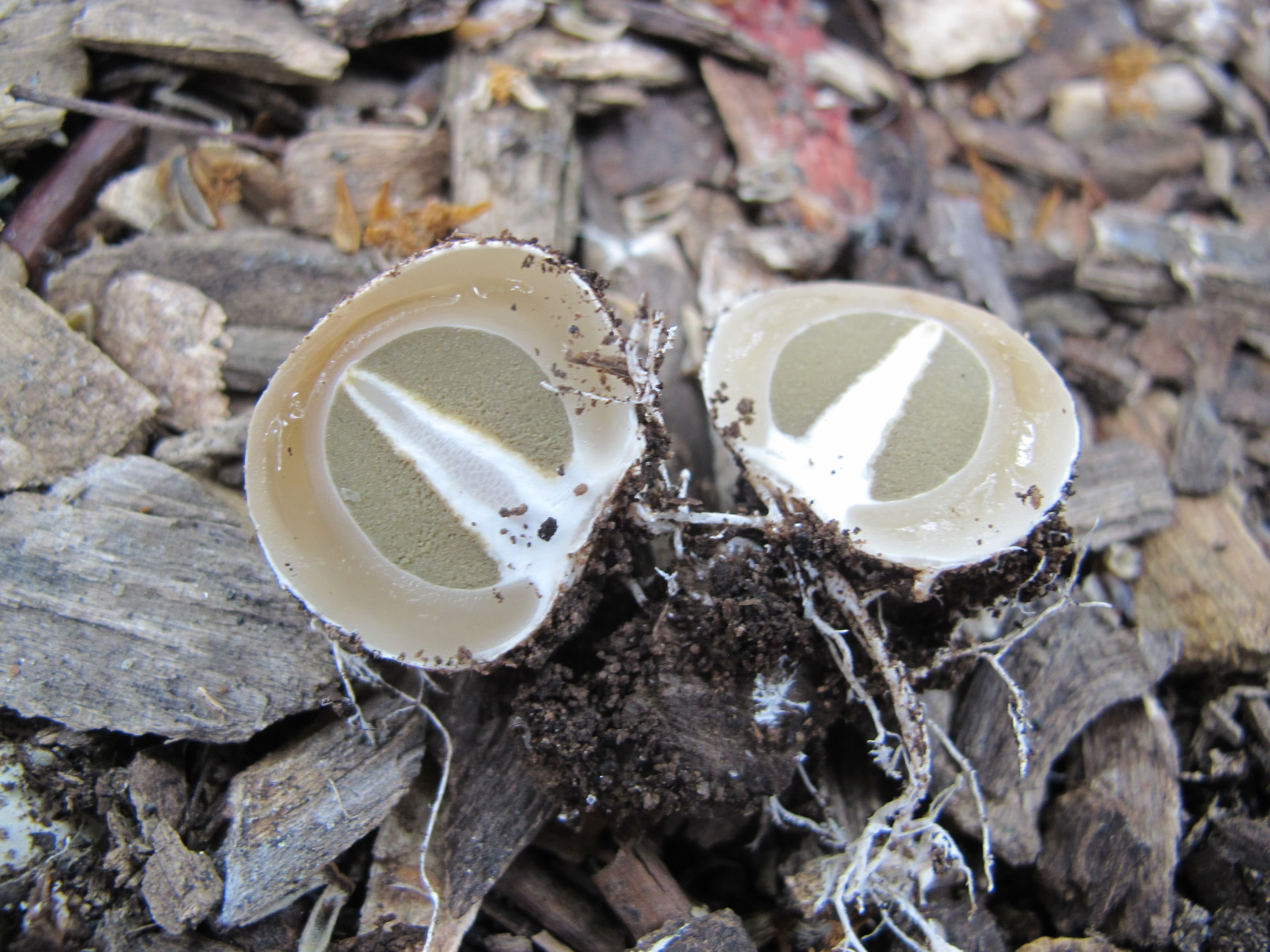 Semblable à un "œuf" blanchâtre ; lorsqu'il est tranché, il révèle le chevalier puant enfermé dans une substance gélatineuse.
