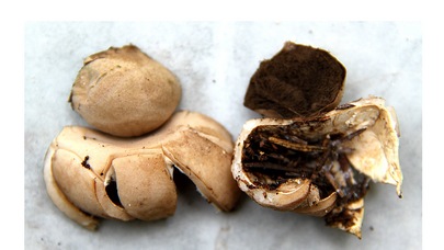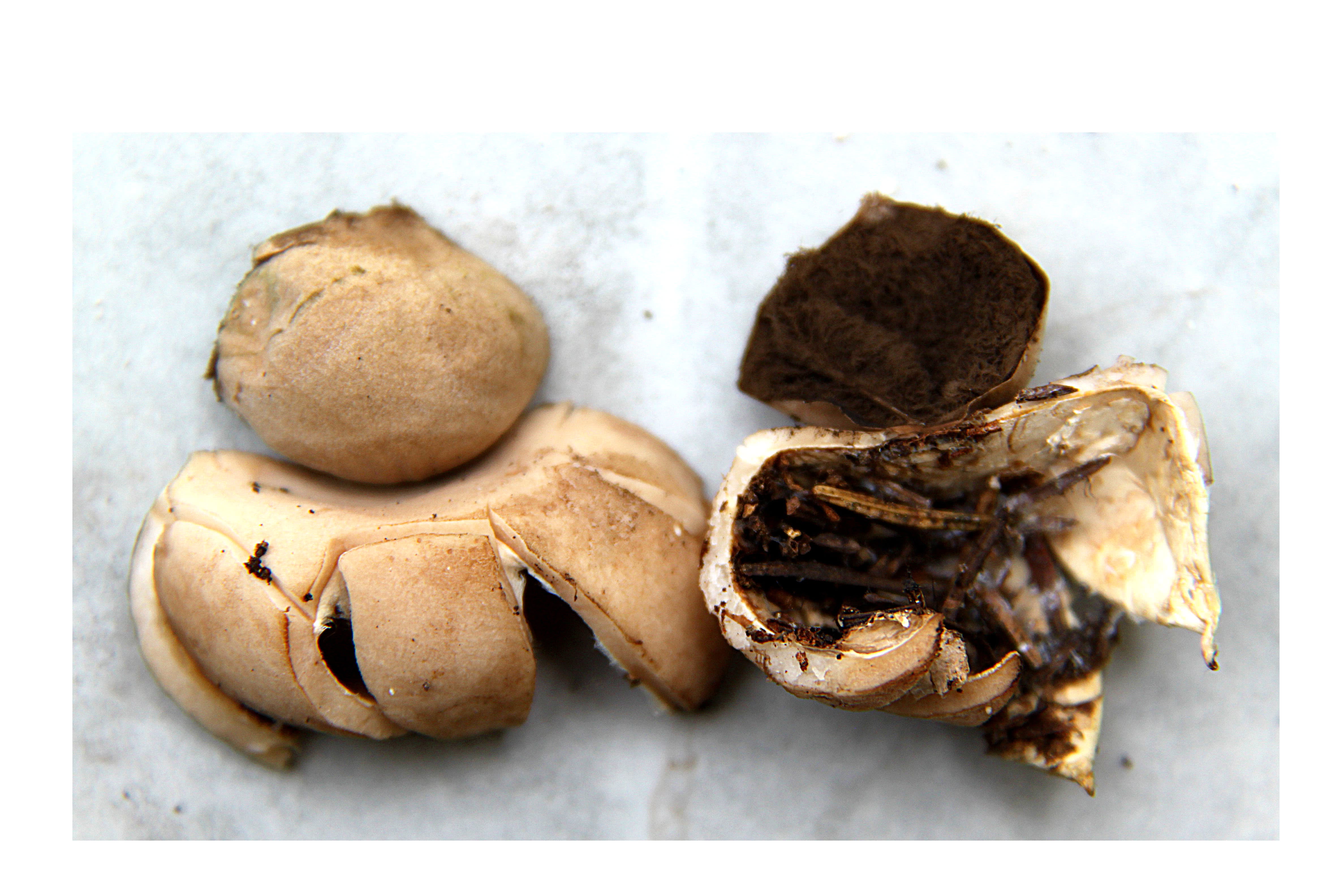 5 à 9 rayons extérieurs blanc crème sont recourbés sous le sac de spores gris papyracé, qui est finement duveteux. Le diamètre extérieur (à travers les rayons) est de 2 mm.5 à 5 cm.