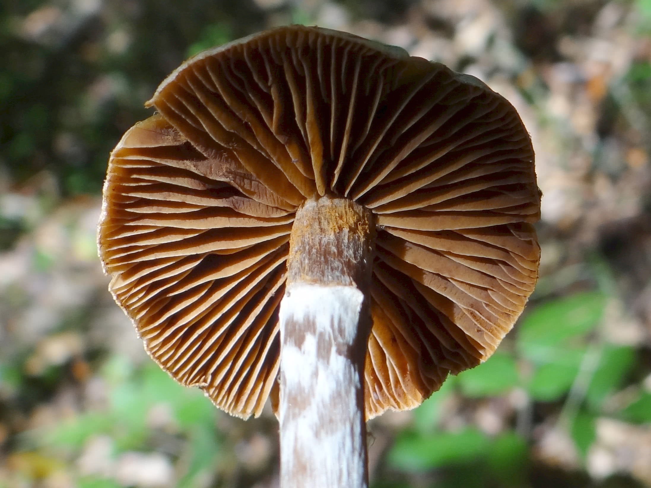 Les branchies sont distantes les unes des autres, grisâtres, puis ochracées ferrugineuses, plus tard presque cannelle, largement émarginées (entaillées), larges de 5 à 8 mm, convexes, avec un umbo aplati ou plus pointu (parfois, l'umbo est plus pointu que l'umbo).2-0.3 in) de large, légèrement ventrue, avec un bord légèrement festonné.