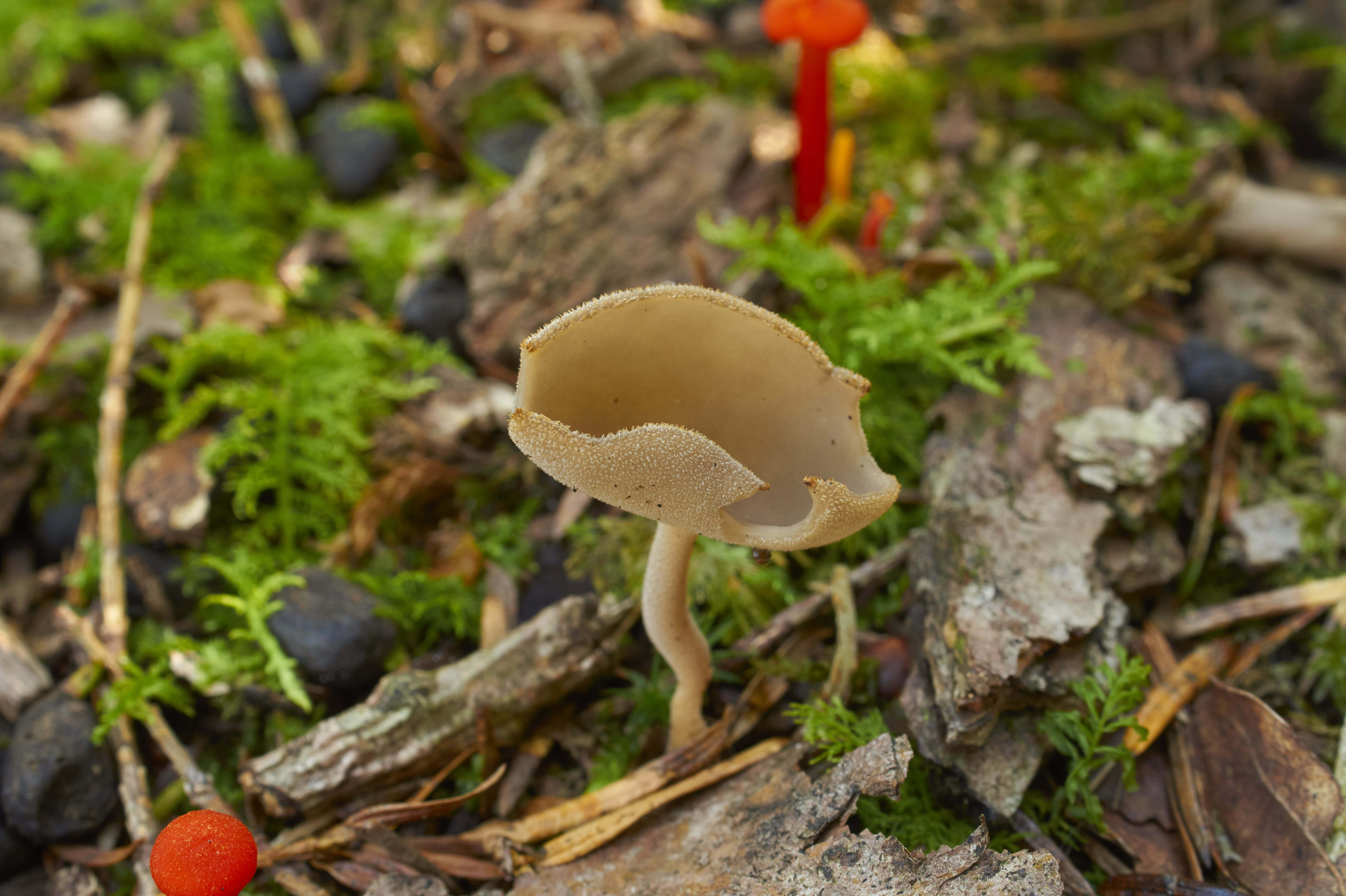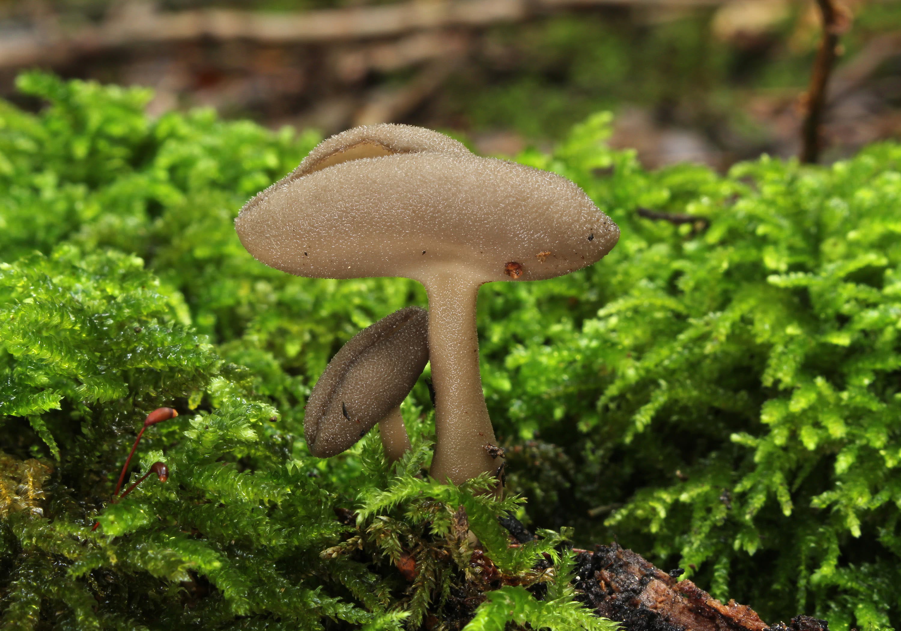 1-6 cm de diamètre ; en forme de coupe ou de disque - ou parfois presque plate ; face supérieure brun grisâtre moyen à foncé, chauve ; face inférieure brun grisâtre clair à moyen, poils pustuleux fins à proéminents (surtout près de la marge).