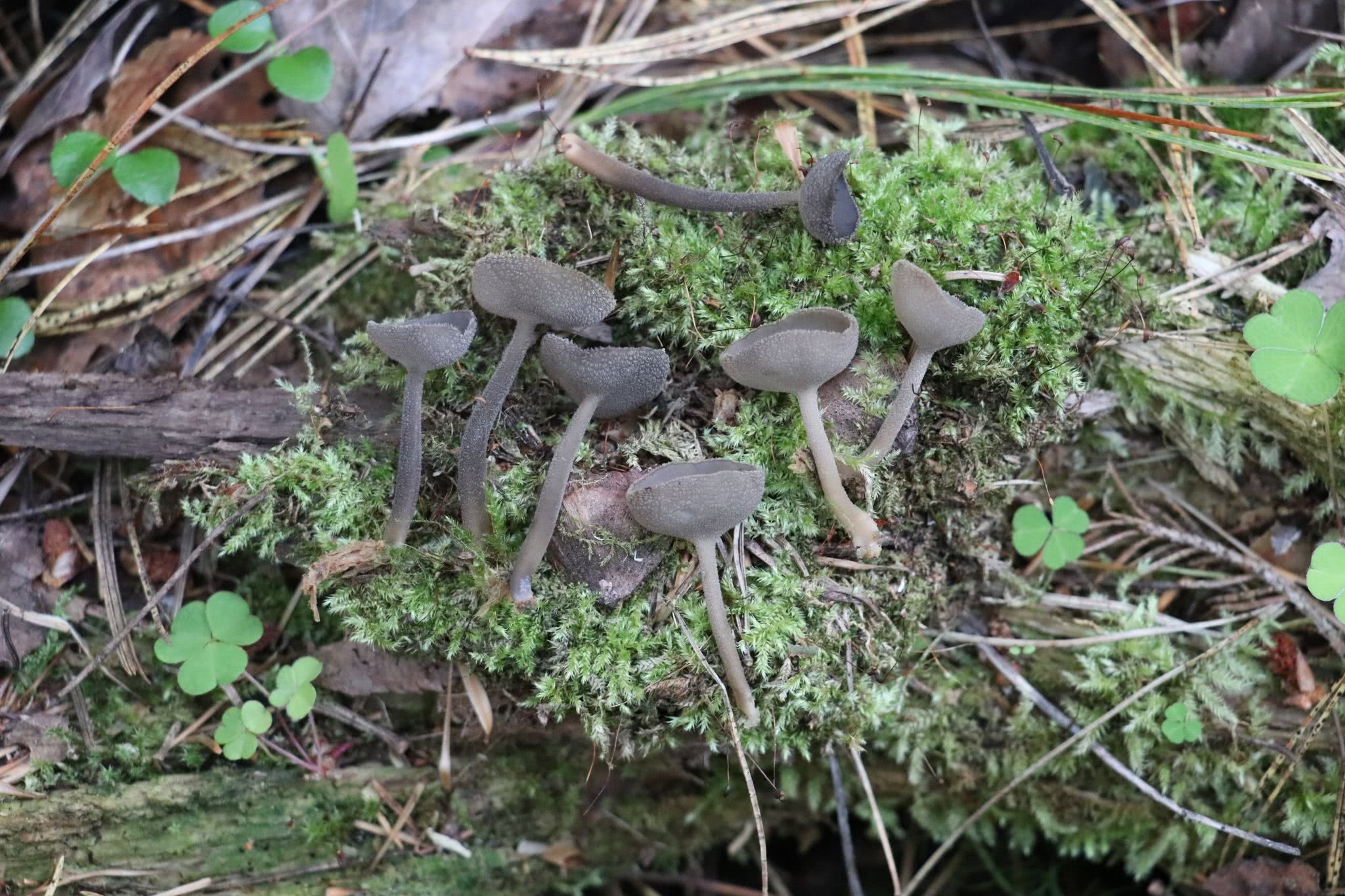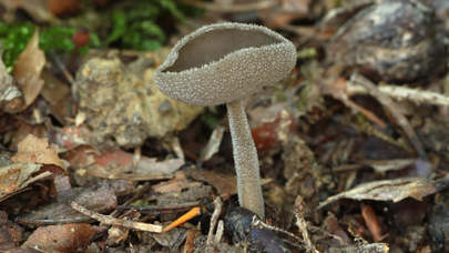 La tige élancée, d'une hauteur maximale de 7 centimètres, supporte un chapeau en forme de coupe, l'ensemble de la fructification étant gris pâle ou brun, la surface intérieure (hyméniale) de la coupe étant généralement plus foncée. C'est l'un des nombreux "champignons de selle" qui apparaissent dans les forêts, en particulier le long des sentiers ; cependant, il se distingue lorsqu'il est jeune par le fait qu'il n'a pas la forme d'une selle.