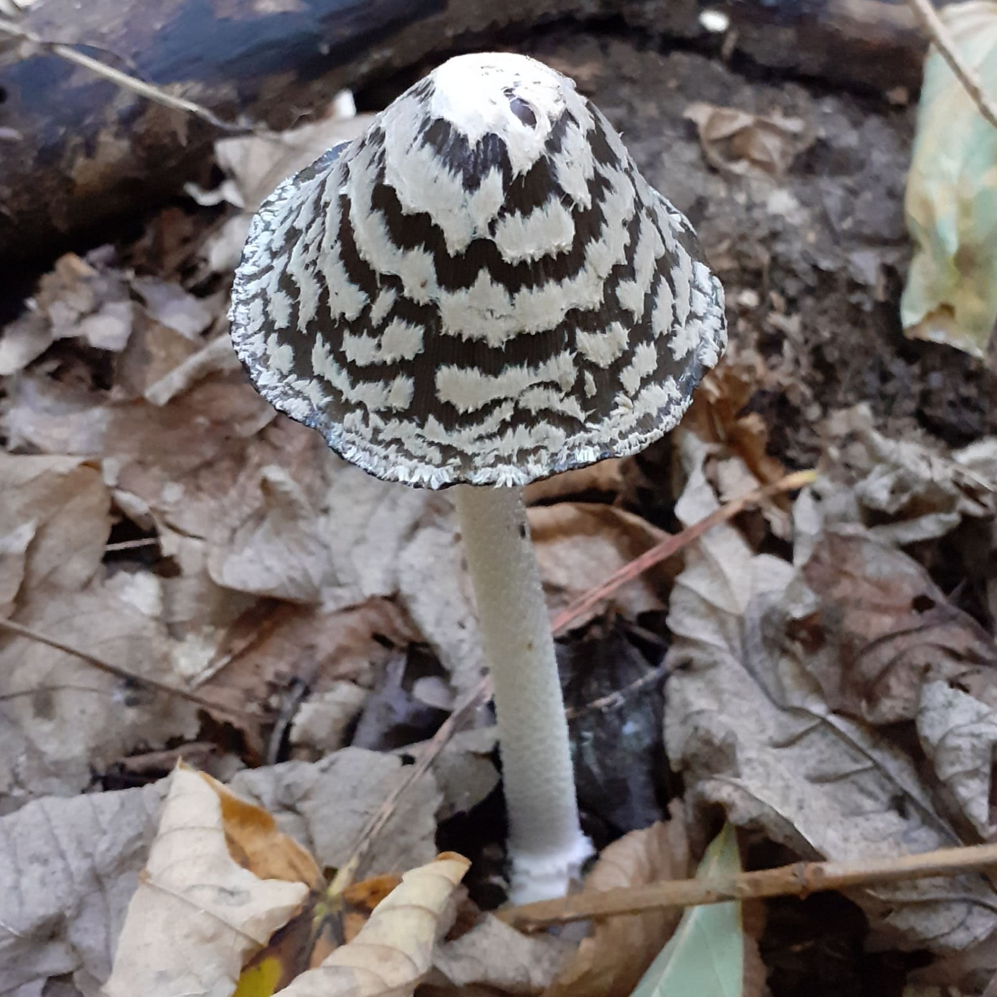 Coprinopsis picacea est une espèce de champignon de la famille des Psathyrellaceae. Le chapeau est d'abord ovoïde et atteint une largeur de 7 cm. Plus tard, elle s'ouvre et prend la forme d'une cloche qui peut atteindre 8 cm de large. Le chapeau est dentelé et de couleur blanche sur les très jeunes champignons. Ce voile s'ouvre avec l'âge et laisse apparaître le fond beige à brun foncé. Des restes du velum blanc, grisâtre ou crème, restent sur le chapeau sous forme de flocons, donnant l'impression d'un plumage de pic ou de pie. Cette espèce n'est pas comestible et provoque des troubles digestifs.