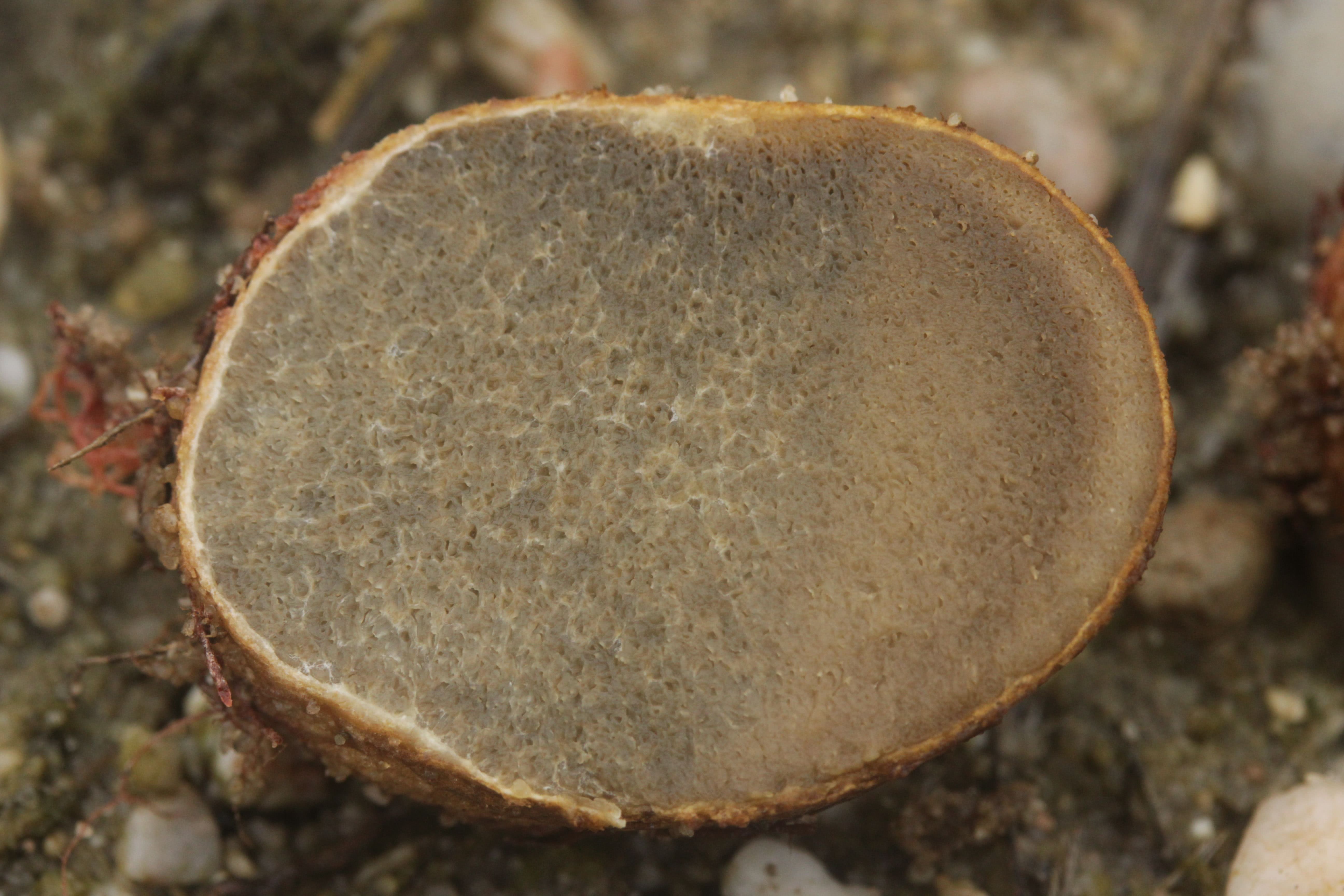 L'intérieur de la gléba porteuse de spores de Rhizopogon luteolus est d'abord presque blanc, puis devient ocre et finalement brun-olive à mesure que les spores approchent de la maturité. L'intérieur du corps du fruit comprend de nombreuses chambres minuscules tapissées de basides, sur lesquelles se développent les spores ; au départ, l'intérieur est mou et spongieux, puis il devient sec et poudreux lorsqu'il est vieux.