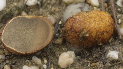 Pisolithus arhizus est plus sombre et beaucoup plus grand ; il est également mycorhizé par les pins.