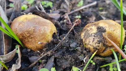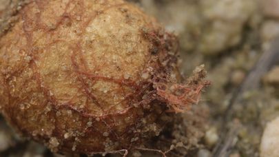Les spores ressemblent beaucoup à une pomme de terre et leur taille et leur forme sont tout aussi variables.5 à 4.Les spores peuvent être ovoïdes, ellipsoïdales, sphéroïdes oblates ou lobées. Elles mesurent 5 cm dans leur plus grande dimension. Il n'y a pas de tige, mais des fils mycéliens en forme de corde se répandent dans le sol (et dans les radicelles des arbres) à partir d'un point central situé sous le corps du fruit. Sa peau extérieure est plus dure que le tissu intérieur, et elle est d'abord blanc cassé, mais devient rapidement ocre et finalement brun-olive. La surface extérieure, qui se fissure généralement de manière irrégulière lorsque le corps du fruit se dilate, est souvent décorée de manière aléatoire par des fils mycéliens fauves qui lui donnent un aspect légèrement laineux.