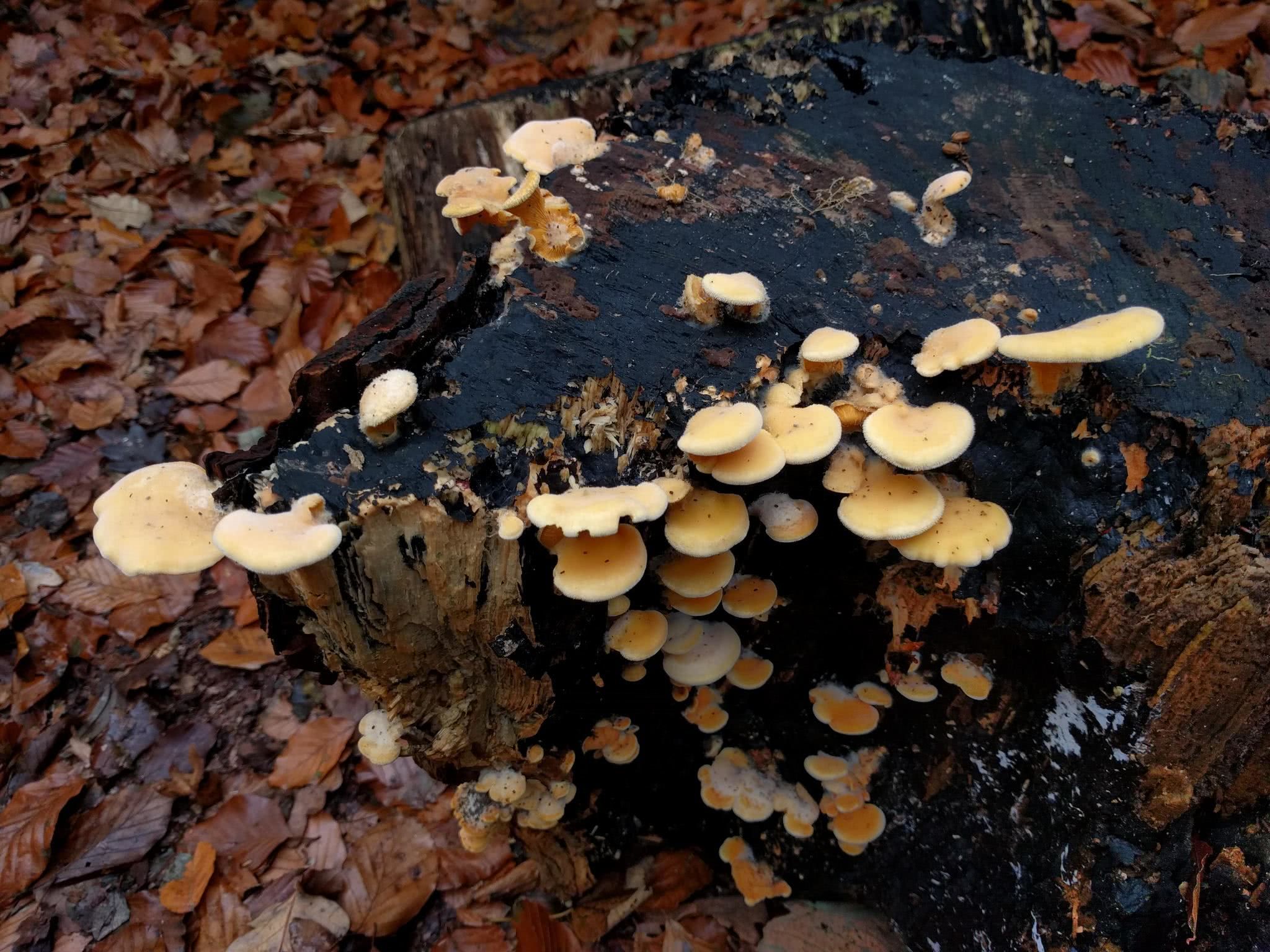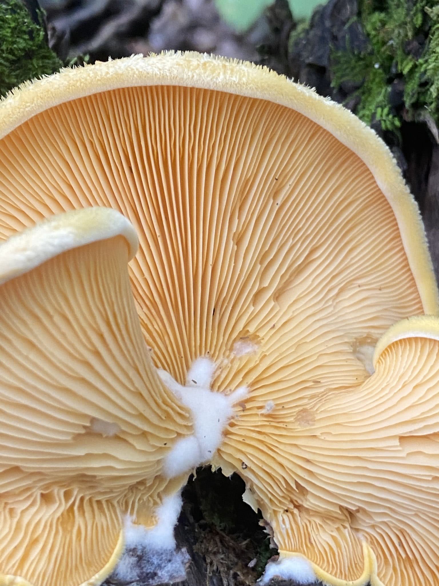 Absentes ou très peu développées et latérales. Les chapeaux semblent parfois partager une "base" mal définie." Occasionnellement, des branchies se développent sur le substrat sous le chapeau, semblant presque résupinées.