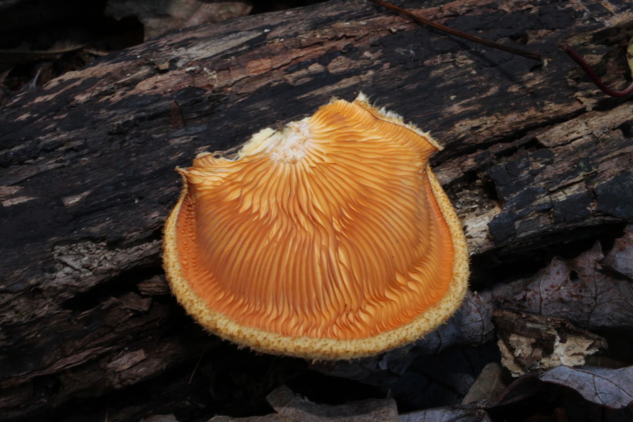 2-7 cm de diamètre à maturité ; plus ou moins en forme d'éventail ou semi-circulaire dans le contour ; plan-convexe ; sec ; très poilu, au moins quand il est jeune ; parfois avec une poussière blanchâtre au début, mais bientôt orange vif, se dégradant en orange jaunâtre ou jaune orangé ; la marge enroulée quand il est jeune, et parfois des meurtrissures brunâtres lorsqu'il est manipulé.