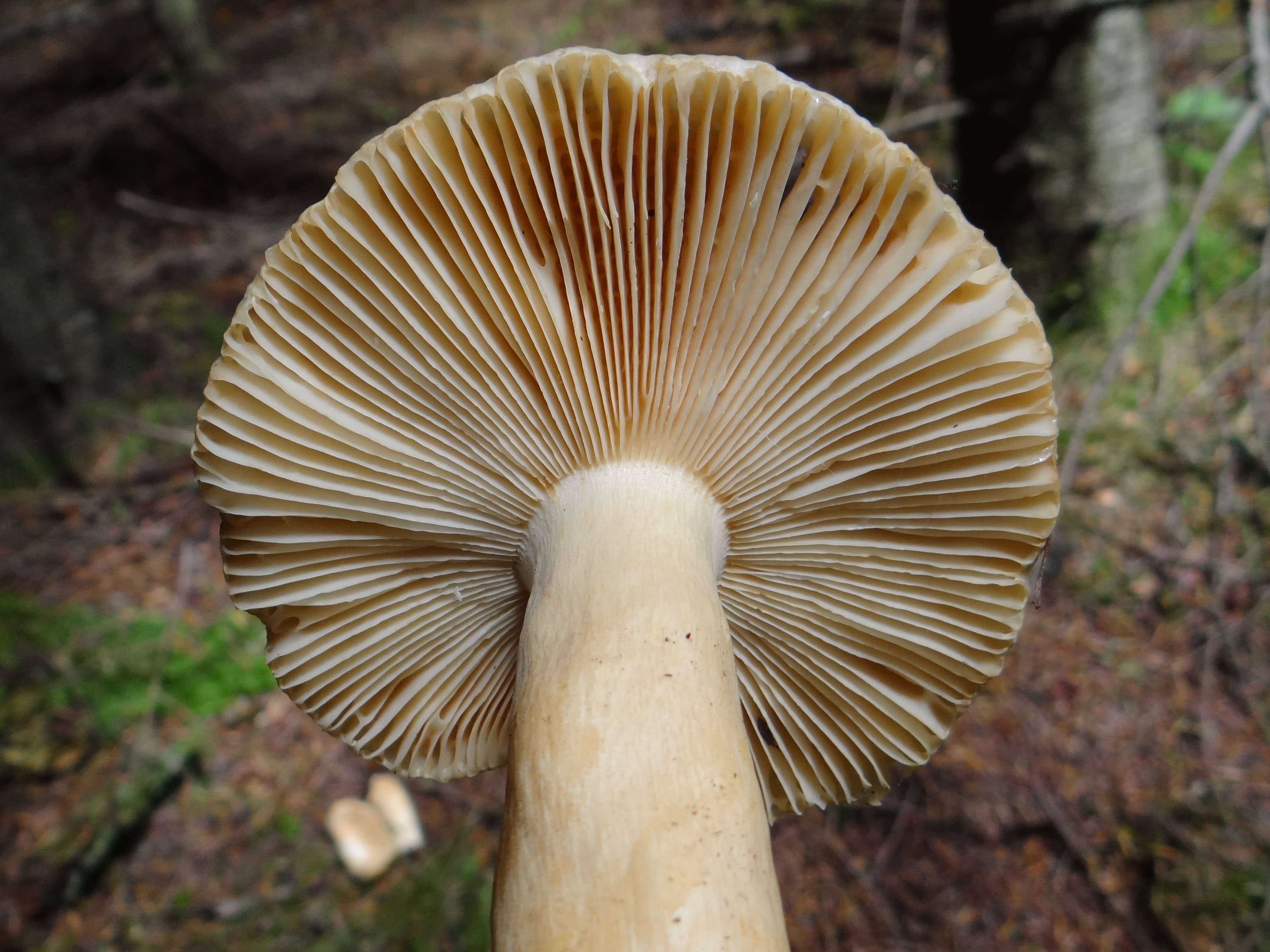 Plus pâle que le chapeau, généralement jaune paille au début mais devenant plus chamois avec l'âge ; modérément serré ; annexé à annexé.