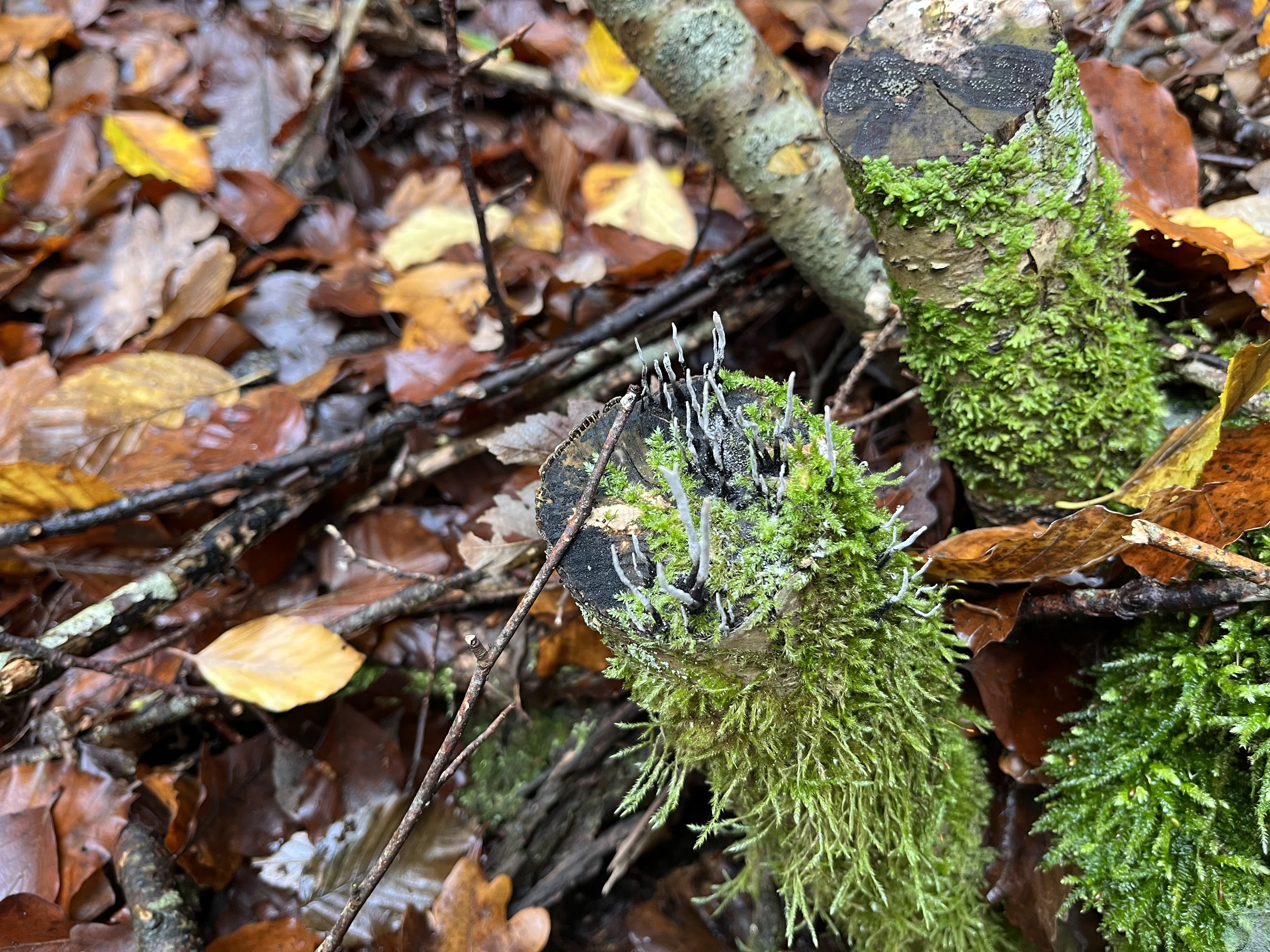 Xylaria carpophila est une espèce de champignon non comestible de la famille des Xylariaceae. Il est immédiatement reconnaissable parce qu'il pousse uniquement à partir des enveloppes dures des graines de hêtre, qui sont connues sous le nom de mât de hêtre. Au printemps, la phase asexuée (épis blancs givrés du stromat) peut être trouvée en abondance. La phase sexuelle (périthèces) se forme en automne et se rencontre assez rarement.