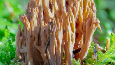 Jusqu'à 6 cm de haut et jusqu'à 4 cm de diamètre, se ramifiant à plusieurs reprises à partir de tiges largement enterrées qui mesurent jusqu'à 1,5 cm de haut.5 cm de long et généralement 4 mm de diamètre ; les branches de couleur ocre commencent généralement près du niveau du sol ; les branches ont de longues pointes de couleur havane qui sont visiblement "froissées". La base d'un corps de fruit est généralement entourée de rhizomorphes filandreux de couleur crème ou parfois de petites feuilles de mycélium ; La chair est blanche.