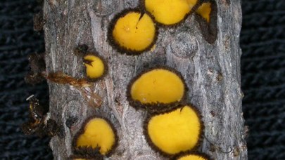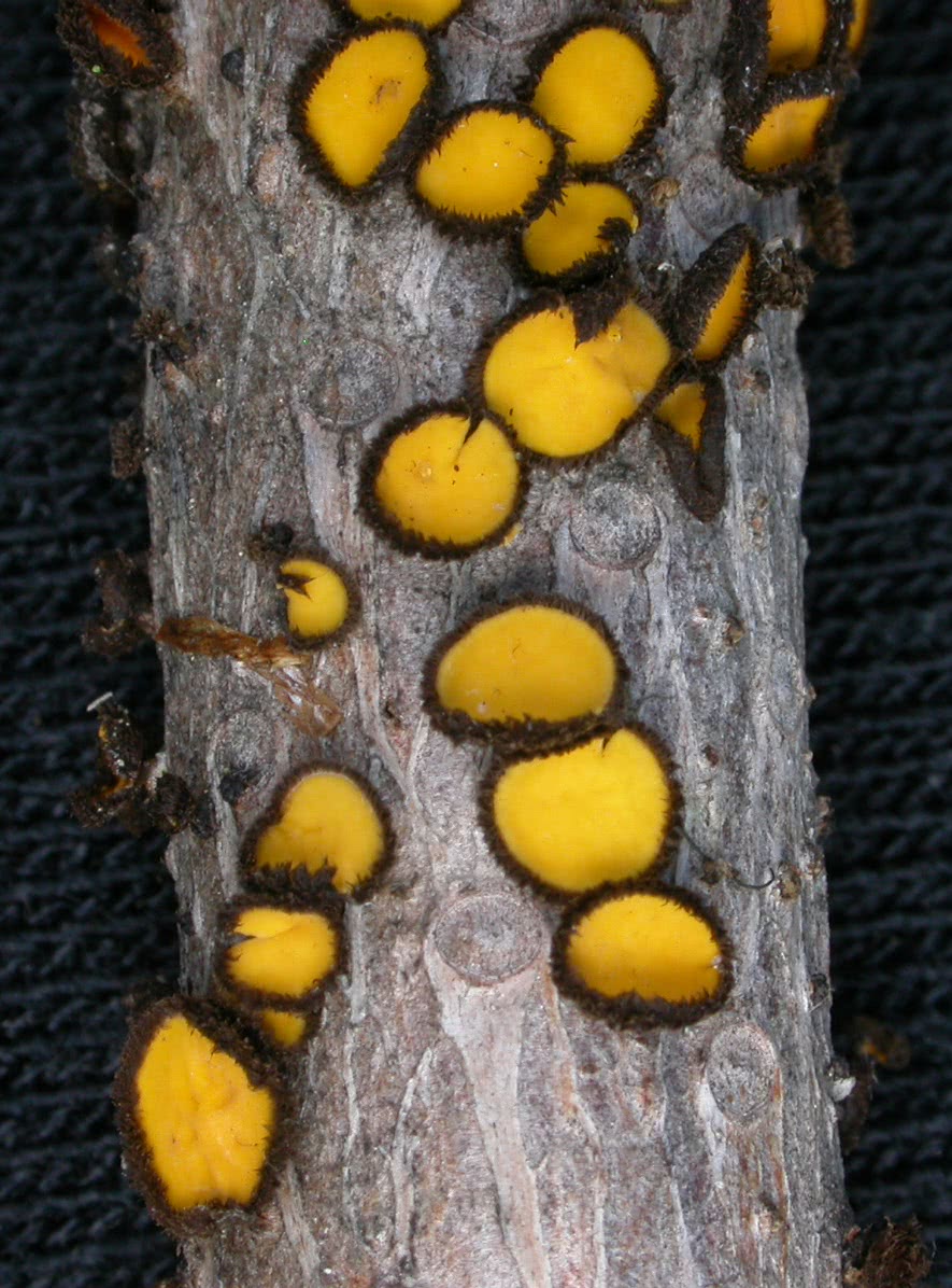 Apothécies sessiles à substipitae, cupules peu profondes à dish, 3-8 mm de large à maturité ; marge plane à incurvée, souvent ondulée, bordée de poils bruns courts et hérissés, parfois hyalins (utiliser la lentille manuelle) ; par temps sec, l'extérieur de la cupule est souvent replié sur la surface fertile ; hyménium glabre, lisse à légèrement ridé, crème, chamois, jaune à jaune-orange ; surface externe densément couverte de poils bruns courts souvent emmêlés avec l'âge ; organe de fructification hygroscopique, se ravivant après séchage.
