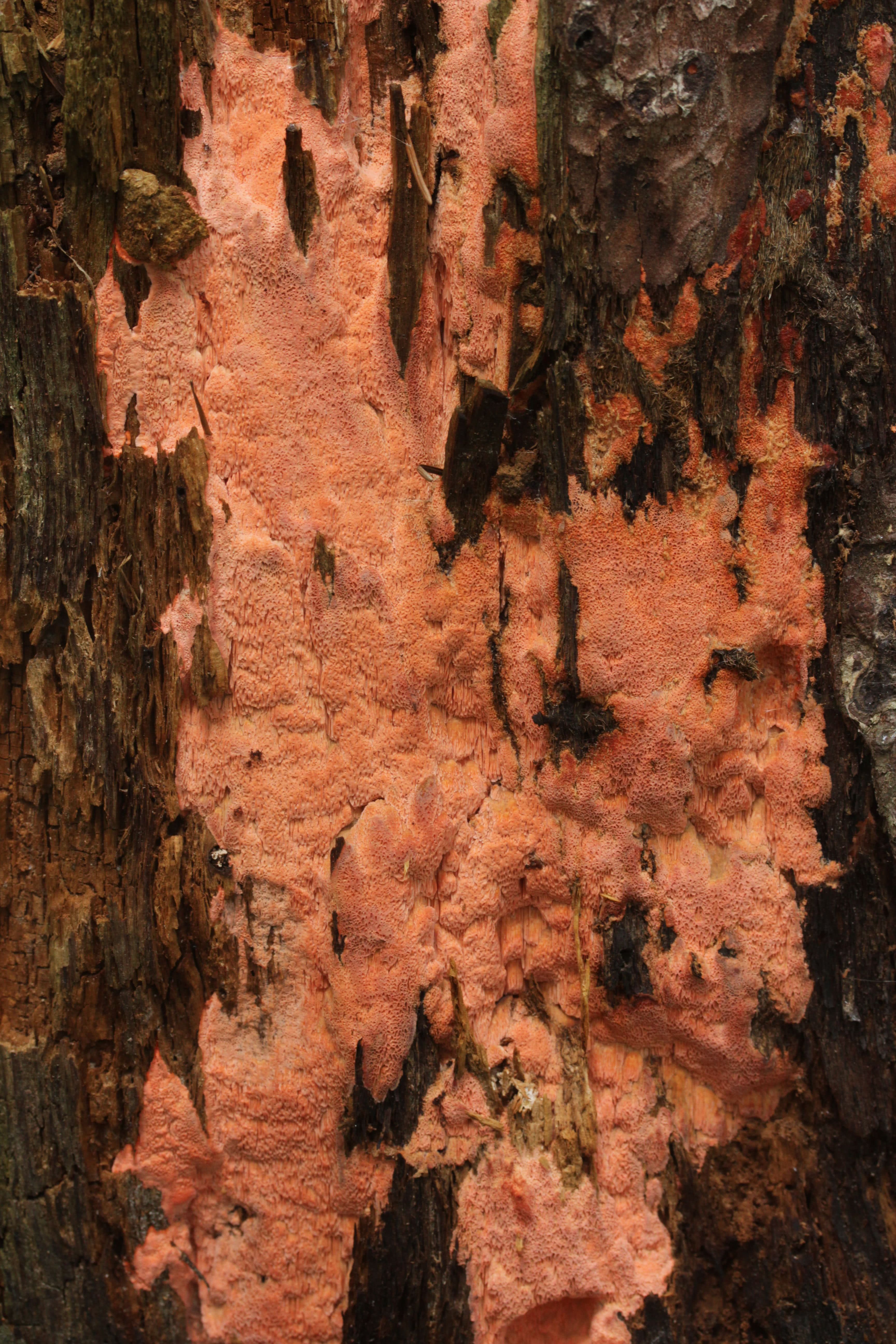 L'hyménophore est tubulaire. La surface de l'hyménophore est blanchâtre avec une teinte rose-orange, rose saumon brillant et blanc crème. En séchant, elle devient blanc sale, grisâtre et brunâtre. Les tubes sont monocouches, cireux, 0.5-2 mm de long, souvent biseautés. Les pores sont arrondis ou anguleux, parfois allongés, souvent avec des bords déchirés, 3-4 par 1 mm d'épaisseur.