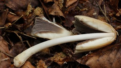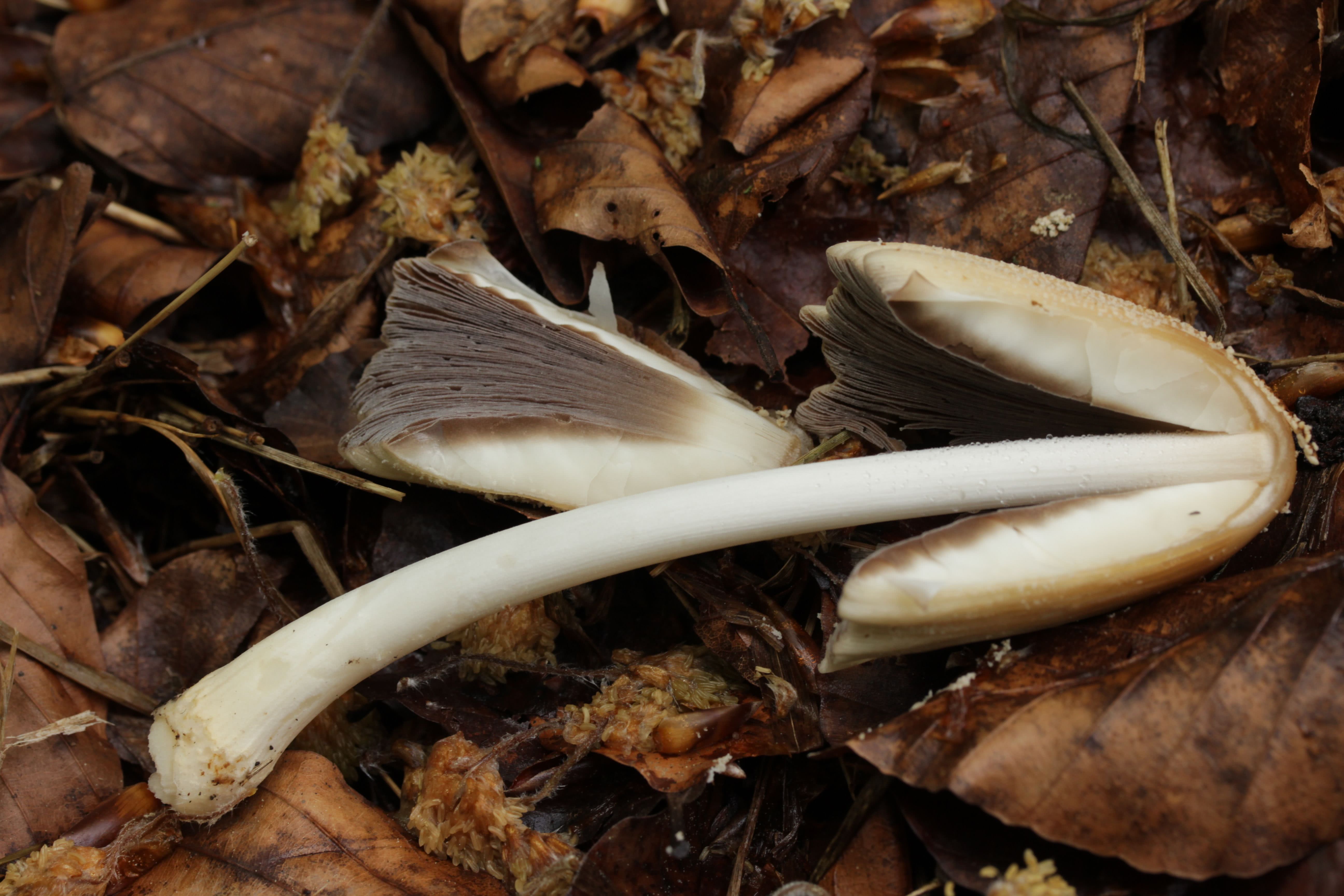 Si vous coupez un jeune champignon en deux, vous constaterez que les branchies sont blanches et qu'elles sont attachées ou non au stipe. Pendant que le pileus s'étend, les branchies s'assombrissent et deviennent grises, puis noires et encrées.